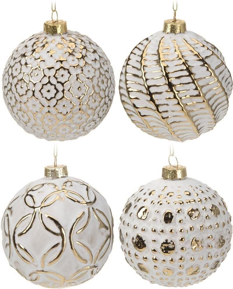 Bombki choinkowe szklane kule biało-złote 12 szt Zestaw dekoracyjnych, szklanych bombek w kształcie kul do powieszenia w kolorze biało-złotym, z pięknym wytłoczonym wzorem o średnicy 8 cm Skład Szkło Kolorystyka biały Styl: glamour Kod EAN: 8711295408472 SKU: ABT316430 Marka: H&S Decoration …
