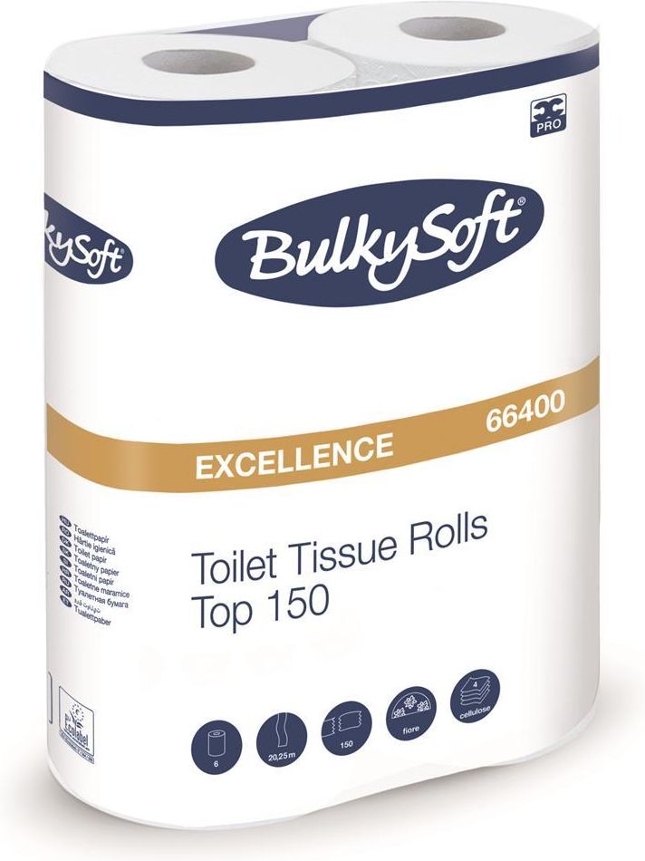 Numer artykułu: 66400 BULKYSOFT papier toaletowy Kolor: Biały Surowiec: Celuloza Ilość warstw: 4 Ilość listków: 150 Długość rolki: 20,25 m Średnica rolki: 11,80 cm Ilość rolek w opakowaniu: 6 rolek Sprzedaż min.: 1op/6 rolek Papier toaletowy w rolkach Bulkysoft Excellence to ekskluzywny, elegancki i komfortowy produkt o najwyższej jakości. Wyróżnia go śnieżnobiały kolor i eleganckie gofrowanie. Złożony jest aż z czterech warstw papieru, wykonanego z czystej, wyselekcjonowanej celulozy. Papier jest wyjątkowo miękki, miły w dotyku, chłonny i bardzo wytrzymały. Jest uzupełnieniem łazienek, w których kluczową kwestią jest higiena oraz prestiż. Stanowi idealne rozwiązanie dla hoteli i eleganckich toalet. BulkySoft to włoska marka, jeden z wiodących producentów artykułów celulozowych, lider wśród europejskich przetwórców bibuły. Szeroka gama produktów higienicznych i papierowych podzielona została na 5 grup, dzięki czemu doskonale zaspokaja potrzeby różnych segmentów Ho.Re.Ca. Produkty powstają z czystej, starannie selekcjonowanej celulozy, posiadają niezbędne certyfikaty (m.in. ISEGA dopuszczający do kontaktu z żywnością), gwarantują najwyższy poziom higieny i bezpieczeństwa. Marka BulkySoft należy do grupy Cartiere Carrara, której filozofia opiera się na zrównoważonym rozwoju w przyszłości, bazuje na szacunku do środowiska naturalnego, pracowników i partnerów biznesowych – działalność i społeczną odpowiedzialność potwierdzają liczne certyfikaty (m.in. ECOLABEL, NORDIC ECOLABEL, PEFC, FSC, ISO 14001).