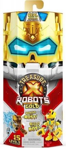 Kolekcja Treasure X Robots Gold to niesamowita przygoda w odkrywanie Robotów przyszłości oraz poszukiwanie skarbów. Zabawa zaczyna się już od otworzenia opakowania. Następnie przechodzimy przez kolejne etapy odkrywania niespodzianek. Szukamy poszczególnych części Robota, które trzeba naprawić usuwając rdzę, aby później zbudować całego Robota. To nie wszystko, każdy Robot ma swój ?rdzeń mocy?, to jego skarb! Czy znajdziesz jego unikatową wersję czyli skarb pokryty złotem? W kolekcji dostępne są trzy zestawy: Roboty, Mini Roboty oraz Mega Robot. TREASURE X ROBOTS GOLD - ROBOT Przejdź przez 15 poziomów odkrywania niespodzianek w poszukiwaniu Robota i jego skarbu. Otwórz opakowanie, w środku są 3 pojemniki. W przezroczystym pojemniku jest pierwszy element Robota, pokryty rdzą! Nalej do pojemnika wody, aby usunąć rdzę. Podnieś wieko pojemnika i odblokuj narzędziem oczyszczony element Robota. Teraz otwórz dwa pozostałe pudełka z zestawu. W pierwszym znajdziesz kolejne części Robota. Połącz je, aby zbudować Robota. Otwórz drugie pudełko, znajdziesz w nim sekretną skrzynię. Wyjmij i rozwal ją! O! Mnóstwo w niej robotycznego osadu oraz ?rdzeń mocy?. Czy znajdziesz ?rdzeń mocy? pokryty złotem? W kolekcji jest 6 Robotów zebrania. Szukaj Robotów z niesamowitymi metalicznymi i przeźroczystymi zdobieniami. Wszystkie mają wymienne części. Części można miksować i wymieniać, aby tworzyć nowe wersje Botów. Im więcej masz zebranych Botów, tym więcej możesz tworzyć nowych wersji. Wiek: 3+.