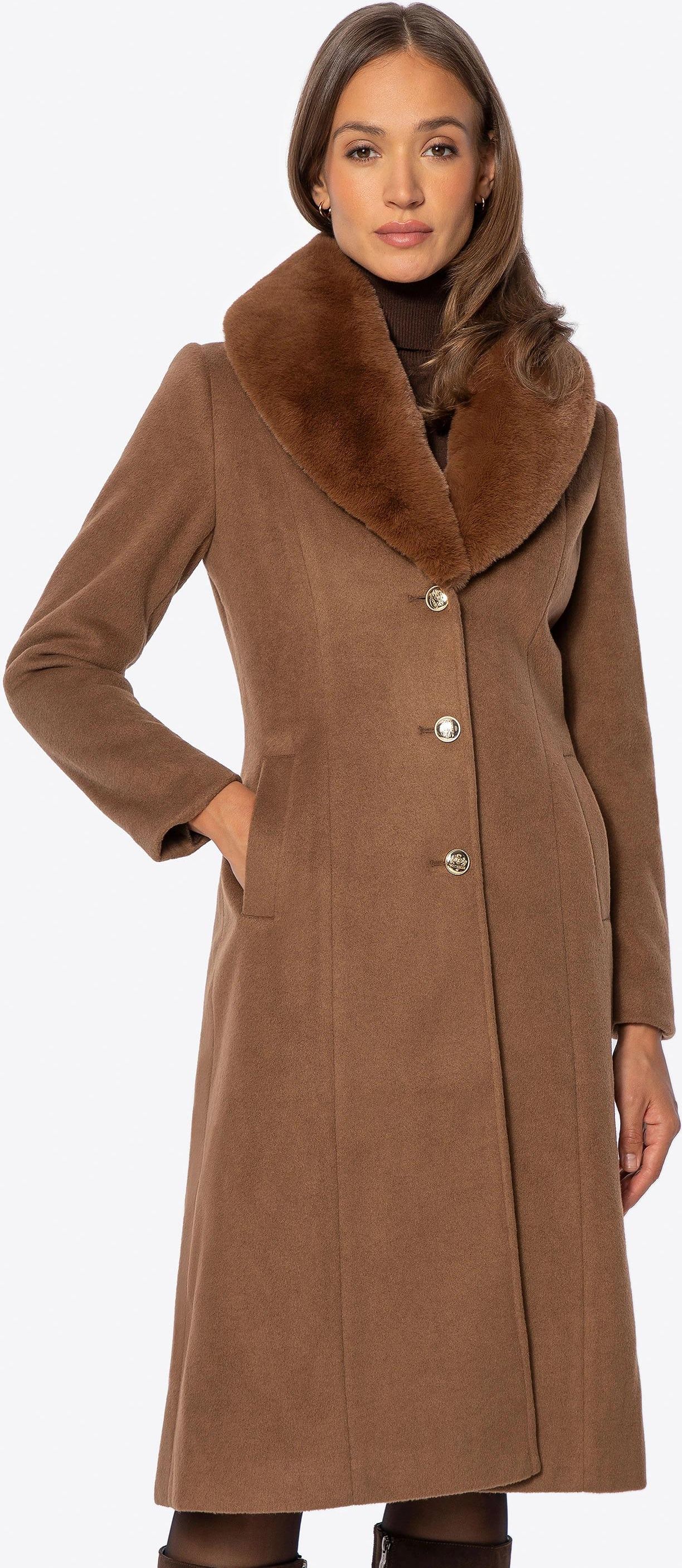 Damski płaszcz z odpinanym sztucznym futerkiem brązowy Karczew