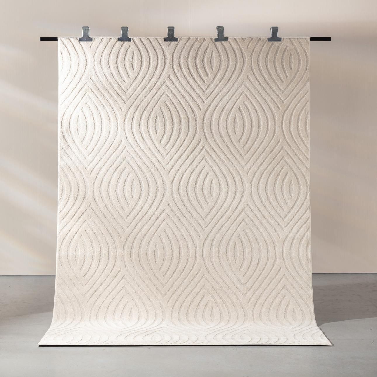 Kremowy dywan z wypukłym wzorem w kształcie fal. Ten dywan w jasnym odcieniu to harmonijne połączenie elegancji i funkcjonalności. Neutralna kolorystyka sprawia, że doskonale komponuje się zarówno z minimalistycznymi, jak i klasycznymi aranżacjami, stanowiąc ozdobę salonu, sypialni czy jadalni. Dywan z wypukłym wzorem wprowadza do wnętrza nowoczesny charakter, jednocześnie dodając mu ciepła i przytulności. Miękkie runo zapewnia wyjątkowy komfort użytkowania każdego dnia, a antystatyczny dywan to doskonałe rozwiązanie dla alergików. Taki dywan na ogrzewanie podłogowe sprawdzi się w każdym domu, równomiernie przewodząc ciepło i podnosząc komfort domowej przestrzeni. Wyprodukowano w Belgii.Wymiary: 200 x 290 cm.Skład: 80% polipropylen, 20% poliester.Instrukcja czyszczenia: odkurzać regularnie, plamy usuwać wilgotną szmatką, polecane profesjonalne czyszczenie.