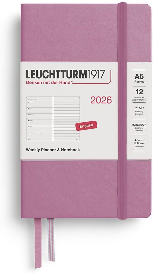 Planer tygodniowy na rok 2026 z notatnikiem Leuchtturm1917 (A6) Planer tygodniowy Leuchtturm1917 w rozmiarze Medium (A6) w kolorze Dusty Rose. Stworzony z myślą o tych, którzy cenią dobrą organizację i elegancję. Cały tydzień znajduje się na jednej stronie (7 dni na stronie), a obok dołączona jest dodatkowa strona na notatki - – idealna na zadania, pomysły czy listy. Planer tygodniowy rozpoczyna się od stycznia 2026 i kończy na grudniu 2026 roku. Dodatkowo zawiera przegląd roku 2026, 2027 i 2028 i planer projektów. Przy datach umieszczono fazy księżyca i święta międzynarodowe. W twardej oprawie z rozkładaną kieszenią na notatki w okładce, dwoma wstążkowymi zakładkami dla lepszej organizacji i naklejkami do archiwizacji. Dodatkowe perforowane strony na notatki, pozwalające na czyste wyrwanie. Elastyczne zamknięcie. Szyty grzbiet umożliwiający wygodne, płaskie otwarcie. Bezkwasowy papier 80g/m2 doskonały do pisania piórem wiecznym. Rozmiar: Pocket (A6) 90 x 150 mm.