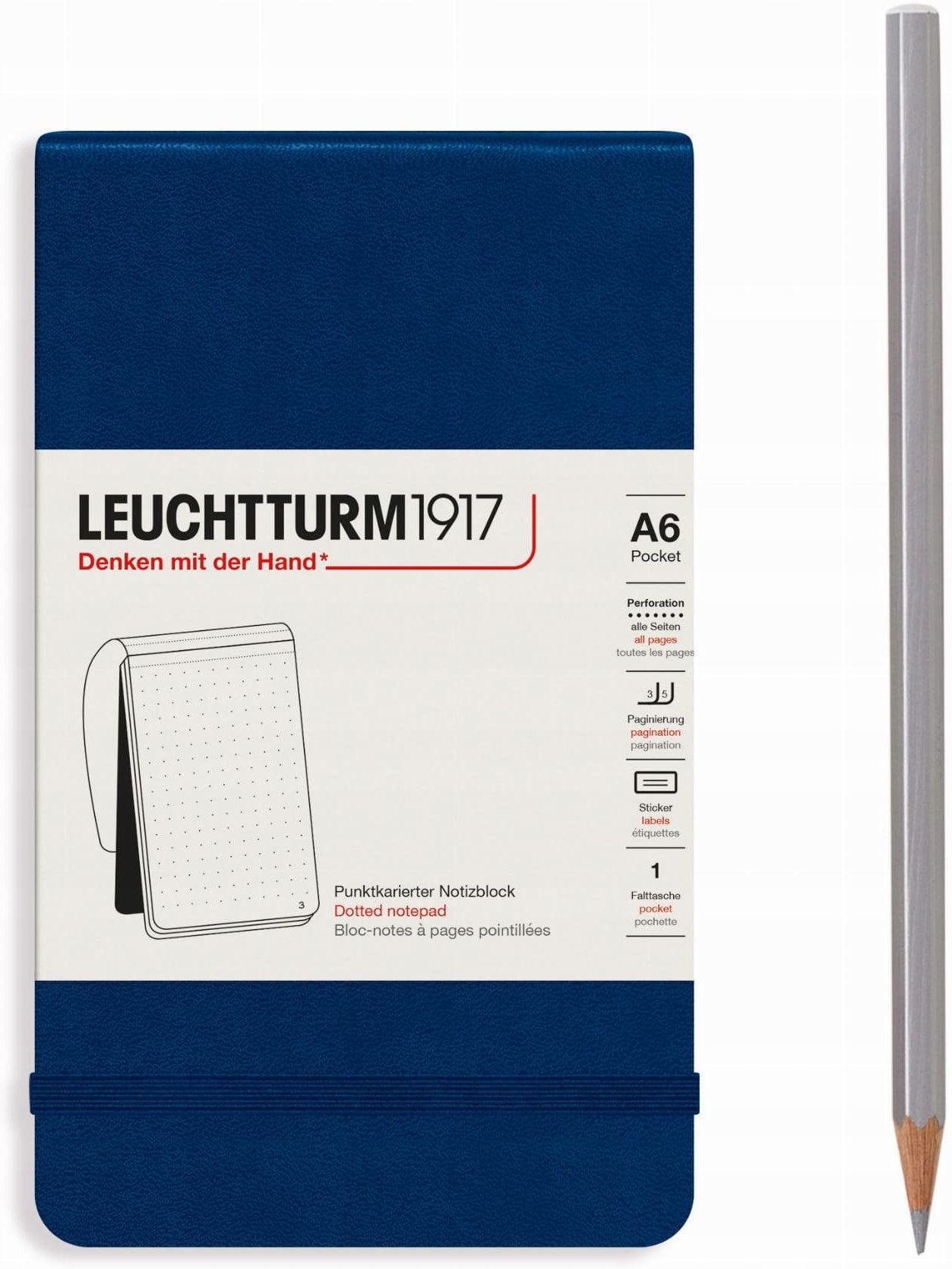 Notatnik Reporterski Leuchtturm1917 Pocket A6 Kropki Granatowy Notes reporterski sprawdzi się, gdy musisz zapisać coś na szybko. Wszystkie kartki są perforowane i łatwe do wyrwania. Notes posiada wszystkie zalety klasycznych notatników Leuchtturm1917. Rozmiar pocket (A6) zmieści się w każdej kieszeni kurtki i dlatego jest idealnym towarzyszem dla każdego, kto musi robić notatki w ruchu. Rozmiar: Pocket A6 (90 × 150 mm). Układ: kropki. Kolor okładki: granatowy. Okładka: twarda. 94 numerowanych kartek (188 stron). Kieszeń na luźne notatki. Elastyczne zamknięcie. Pusty spis treści. Szyty grzbiet - płaskie otwarcie. 8 perforowanych kartek na końcu notatnika. Papier przystosowany do atramentu (80 g/m2). Naklejki do oznaczania i archiwizacji.