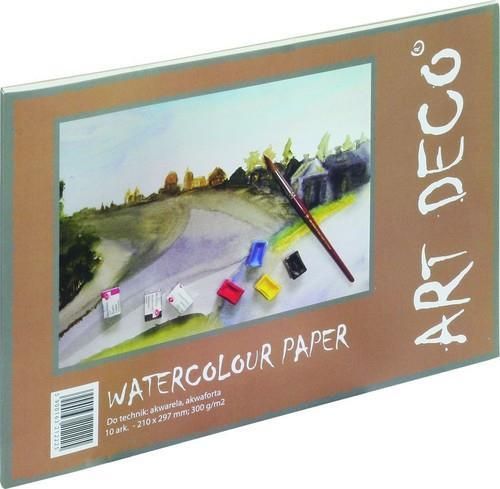 * blok malarski ART DECO * papier dwustronnie fakturowany * gramatura: 300 g/m2 * format: A4 * rozmiar: 21 x 29,7 cm * w bloku znajduje się 10 arkuszy * papier przeznaczony do akwareli i akwaforty (AKWARELA - określenie techniki malarskiej oraz nazwa obrazów nią wykonywanych, skupiających się wokół tematu pejzażu i martwej natury - technika, w której wykorzystuje się farby akwarelowe - będące farbami wodnymi - z punktu widzenia artystycznego, eteryczna i świetlista, z punktu kolekcjonerskiego - jeśli jest dziełem klasyków - równie atrakcyjna - farba akwarela - farba rozpuszczalna w wodzie do malowania na papierze - plamy farby akwarelowej są przejrzyste, niekryjące, lekkie, widać przez nie podłoże, a także wcześniej położone plamy - artyści mieszają farby akwarelowe z dużą ilością wody, aby uzyskać plamy jak najbardziej swobodne), (AKWAFORTA, inaczej również kwasoryt, to technika graficzna druku wklęsłego zaliczana do dziedziny grafiki warsztatowej, artystycznej - artysta przygotowuje płytę metalową, czyli formę drukarską, z rysunkiem wyrytym igłą w werniksie i kolejno wytrawionym kwasem, którą odbiją na papierze (WERNIKS - szlachetny lakier stosowany do celów artystycznych - w najprostszej postaci jest roztworem naturalnej lub syntetycznej twardej żywicy w olejku lotnym, alkoholu lub innym rozpuszczalniku - w zależności od przeznaczenia i wymagań skład werniksu może być dużo bardziej złożony)) * jednostka sprzedaży 1 blok (10 arkuszy) * dystrybutorem bloku ART DECO jest firma KW TRADE - KW TRADE działa pod tą nazwą od 2000 roku, jednak początki firmy to rok 1990 - specjalizuje się w imporcie, eksporcie oraz dystrybucji produktów uznanych marek branży biurowej i szkolnej - oferta obejmuje zarówno markowe produkty dla wymagających klientów, jak i asortyment w konkurencyjnych cenach wymaganych do przetargów i zamówień publicznych