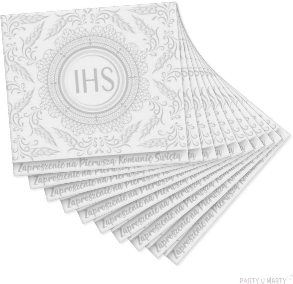 Zaproszenia na Pierwszą Komunię Świętą to elegancki sposób na zaproszenie gości na tę wyjątkową uroczystość. Klasyczny motyw religijny oraz jasna, stonowana kolorystyka podkreślają podniosły charakter wydarzenia, a wysokiej jakości wykonanie zapewnia trwałość i estetykę.✅ Centralnym elementem zaproszenia jest okrągły ornament z napisem ";IHS"; – chrystogramem odnoszącym się do imienia Jezusa Chrystusa. Wokół niego znajdują się delikatne, koronkowe zdobienia przypominające mandalę lub haft.✅ Tło zaproszenia ozdobione jest roślinnymi motywami, takimi jak kłosy zboża oraz wijące się ornamenty, które często pojawiają się w grafice sakralnej i komunijnej.✅ Na dole widnieje napis: ";Zaproszenie na Pierwszą Komunię Świętą";, zapisany elegancką, odręczną czcionką.Całość utrzymana jest w jasnych odcieniach szarości i bieli, które nadają zaproszeniom uroczysty i subtelny wygląd. Zestaw zawiera 10 sztuk zaproszeń wraz z kopertami, gotowych do wypełnienia. To doskonały wybór dla osób, które chcą w wyjątkowy sposób zaprosić bliskich na tę ważną uroczystość. biały,I Komunia Św.,kwadratowy,MAKI,srebrny