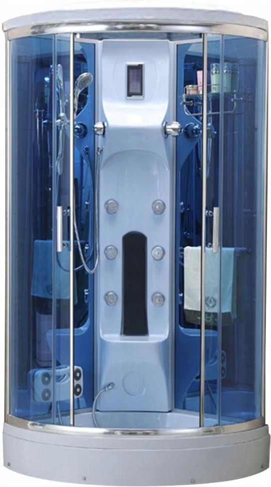 Kabina prysznicowa z hydromasażem 100x100x220 cm MODEL: GK-0210 (WERSJA BIAŁA) OPIS PRODUKTU: Wymiary zewnętrzne: 100 x 100 x 220 cm Typ brodzika: niski brodzik Grubość szkła hartowanego: 5 mm Materiał wykonania: – Brodzika: Akryl (ABS – kolor biały) – Ramy: aluminium (srebrny) – Ścian tylnych: szyby (błękitne – szyby lustrzane) Wyposażenie: – Dysze do hydromasażu (2″): 6 szt. – Bateria prysznicowa: tak (zawór mieszający, rozdzielacz) – Pokrętła pokryte chromem: tak – Wielofunkcyjny prysznic ręczny: 1 szt. (regulowany: góra/dół) – Deszczownica: 1 szt. – Wentylator wyciągowy: 1 szt. – Półka na kosmetyki: 1 szt. – Uchwyt pałąkowy: 1 szt. – Siedzisko z oparciem: 1 szt. – Masażer do stóp: 1 szt. – Światło LED (zamontowane w dachu): 1 szt. (1 kolor – biały) – Panel sterowania: tak – Radio: 1 szt. – Głośnik: 1 szt. – Jonizator: 1 szt. DODATKOWE INFORMACJE: Dno brodzika antypoślizgowe Typ kabiny: narożna Typ drzwi: podwójne przesuwne Węże przyłączeniowe do wody: tak (1/2″) Elementy montażowe: tak
