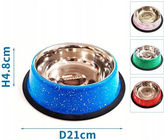Miska marmurkowa dla psa kota na gumie S Miska marmurkowa dla psa kota na gumie 4 kolory wybór Metalowa miska z antypoślizgową gumową podkładką (cena dotyczy 1szt.) Miska wykonana została ze stali nierdzewnej. Charakteryzuje się dużą wytrzymałością i dobrze spełnia swoją rolę w domu jak i w warunkach zewnętrznych. Guma przy podstawie oraz kształt miski zapobiegają przesuwaniu oraz przewracaniu się. Antypoślizgowy spód, chroni również przed porysowaniem, powierzchnię na której stoi. Specyfikacja Wymiary: średnica 21cm wysokość 4,8cm Pojemność: 0,45l Materiał: stal nierdzewna Kolor: Różowy / Niebieski / Czerwony / Zielony *Podczas składania zamówienia prosimy o informację wybranego koloru. Jeśli informacja nie zostanie podana kolor wysyłamy losowo. Miska metalowa dla psa kota na gumie 21 cm Stan: nowy Kolor: Wielokolorowy Materiał: Stal nierdzewna Przeznaczenie: dla psów, dla kotów Rodzaj: Miska Kod producenta: fidkaa