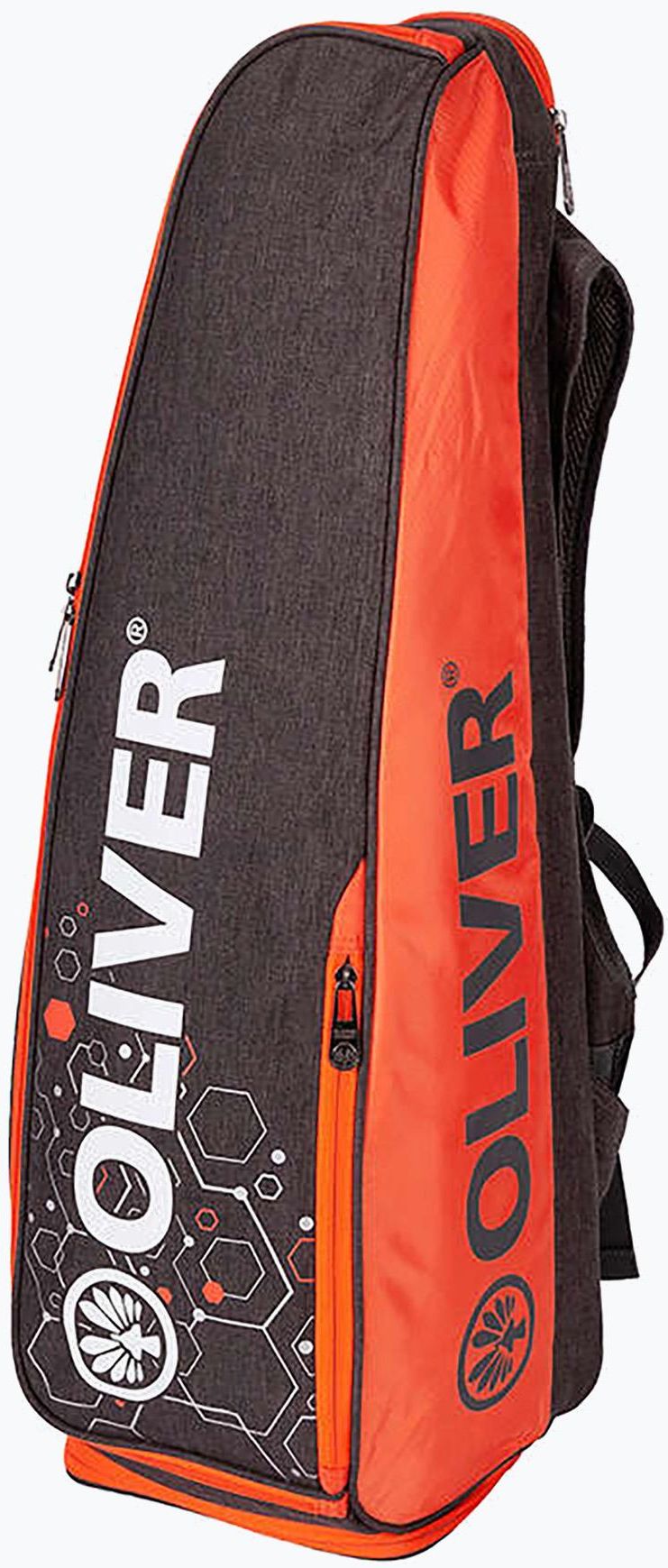 Innowacyjny plecak na rakiety marki Oliver. Posiada dwie główne komory na rakiety i strój oraz dodatkową kieszeń przednią na akcesoria i dolną na buty lub mokry strój / ręcznik. Plecak posiada wygodne, regulowane szelki, które można spiąć ze sobą klamrą. Kieszeń na buty: Tak Kolor: Szary, Pomarańczowy Materiał: 100% Poliester Wymiary: 25 x 22 x 72 cm