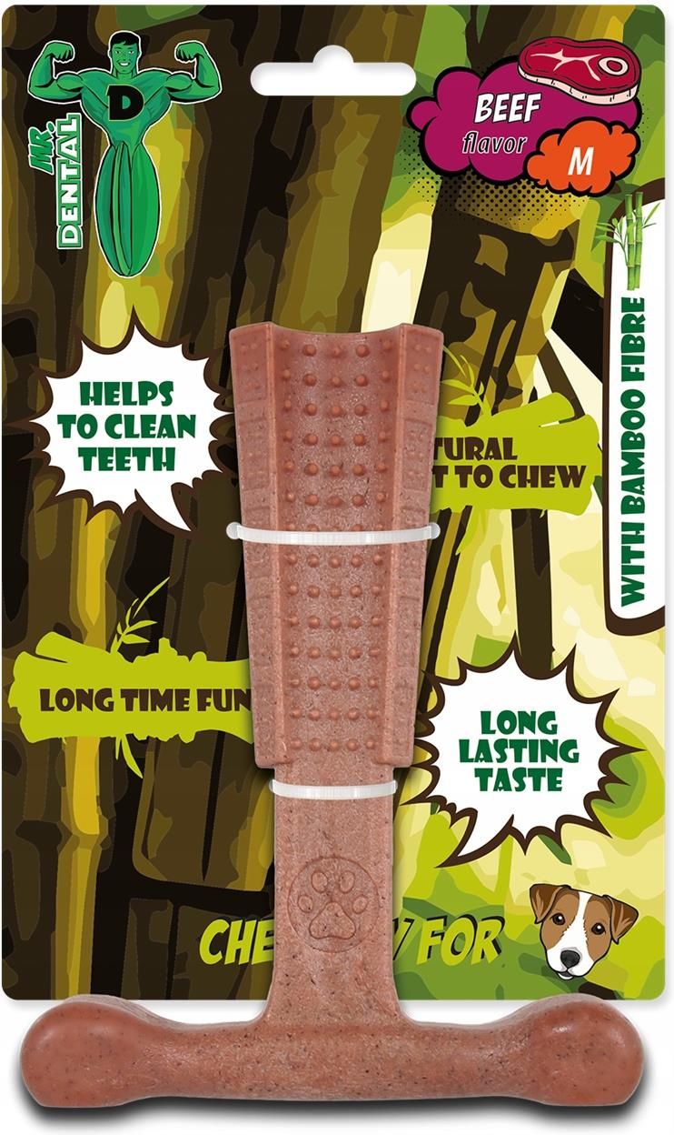 Charakterystyka Mr Dental dentystycznej zabawki dla psa Cechy zabawki: rozmiar M materiał: polipropylen + bambus Zabawka wspierająca higienę psiego pyska. Gryzak do czyszczenia zębów i delikatnego masowania dziąseł psa, doskonale sprawdzający się podczas wspólnej zabawy zarówno w domu jak i ogrodzie. Zabawka o zapachu wołowiny, która dostarczy Twojemu psu radości, a przy okazji oczyści jego zęby z osadu. Dzięki temu, że gryzaki Mr Dental dostępne są w kilku rozmiarach, kształtach oraz smakach, będą odpowiednie dla psów w różnym wieku i rozmiarze. Gryzaki Mr Dental są zrobione z bambusowych włókien i polipropylenu (Składają się w 90% z PP (polipropylenu) + pozostałe 10% to włókno bambusowe). Bambus sprawia, że jest to zabawka przeznaczona do długiego żucia, dzięki polipropylenowi jest odporna na zniszczenia. Zalety zabawki: podczas zabawy masuje dziąsła psa czyści zęby psa pomaga utrzymać higienę jamy ustnej u psa zaspokaja potrzebę gryzienia dzięki gryzieniu pies wzmacnia mięśnie szczęk ma atrakcyjny zapach mięsa wołowego Pomimo, że zabawka jest solidnie wykonana, może ulec zniszczeniu, przy wyraźnych śladach zużycia, należy wymienić ją na nową. Zabawka przeznaczona jest do treningu i zabawy z psem wyłącznie pod nadzorem człowieka. Dane producenta:Plaček Pet Products s.r.o.Revoluční 1381/III290 01 PoděbradyCzech RepublicEmail: info@placek.cz