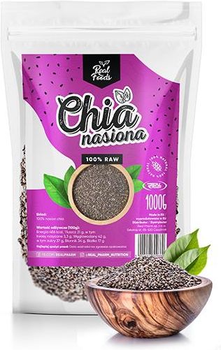 Nasiona CHIA SZAŁWIA HISZPAŃSKA PREMIUM ŚWIEŻA 1KG Szałwia hiszpańska (Salvia hispanica L.), zwana też chia to roślina pochodząca z centralnej i południowej części Meksyku oraz z Gwatemali, bardzo ceniona ze względu na nasiona. Uprawiana była już przez Azteków w czasach prekolumbijskich. Obecnie w Meksyku i Gwatemali nasiona jej służą powszechnie do przygotowywania odżywczych napojów i żywności. Chia jest uprawiana w celach handlowych dla nasion bogatych w kwasy tłuszczowe omega-3. Uzyskuje się z nich około 25-30% oleju, w większości kwasu α-linolenowego. Nasiona zawierają białko, tłuszcz, błonnik , znaczny poziom przeciwutleniaczy (kwas chlorogenowy i kawowy, myrycetyna, kwercetyna oraz flawonid kamferol). Olej z nasion chia zawiera bardzo wysokie stężenie kwasów tłuszczowych omega-3 – około 64%. Nasiona chia nie zawierają glutenu. Nasiona chia są tradycyjnie spożywane w Meksyku i południowo-zachodnich Stanach Zjednoczonych. Nasiona chia służyły jako podstawowy artykuł spożywczy Azteków w środkowym Meksyku. Kronikarze jezuiccy opisują chia jako trzecią, najważniejszą dla Azteków uprawę, zaraz po fasoli i kukurydzy. W 2009 r. Unia Europejska zatwierdziła nasiona chia jako produkt spożywczy, pozwalając na stosowanie ich jako dodatek do całkowitej masy chleba w ilości do 5%. Dawkowanie Dzienne spożycie nasion chia nie powinno przekraczać 15 g. Nasiona chia są zdrowym i bardzo ciekawym dodatkiem do diety. Można dodawać całe lub zmielone nasiona chia do musli, jogurtu, shake'ów, sałatek oraz wypieków."Chia Fresca" to napój popularny w Meksyku oraz Ameryce Środkowej. Mieszamy 2 łyżeczki nasion chia z 250-300ml wody, następnie dodajemy sok z cytryny lub limonki oraz cukier do smaku. Sposób przechowywania Przechowywać w suchym i ciemnym miejscu, niedostępnym dla dzieci. Zawartość Opakowanie zawiera 1000g nasion chia. Skład nasiona chia Kraj pochodzenia Paragwaj