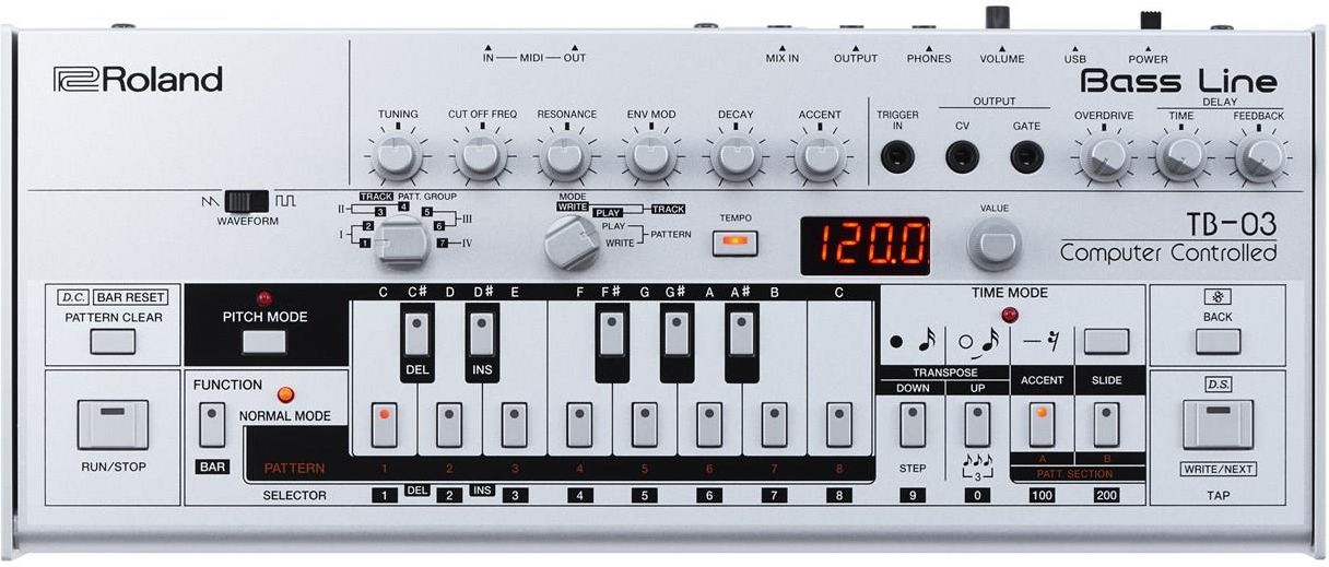 KLASYCZNE BRZMIENIE SYNTEZATORA TB-303 W DŁONI Zasilany bateryjnie TB-03 jest bezpośrednim potomkiem słynnego syntezatora TB-303 Bass Line. Układ i elementy sterowania nie zmieniły się, więc działa, jak oryginał. Brzmi również tak samo, dzięki zaawansowanej technologii ACB, odtwarzającej hipnotyczne rytmy magicznej srebrnej skrzynki. Ale nowy TB-03 idzie nawet dalej, dzięki kilku ulepszeniom, których nie ma w modelu oryginalnym. Czterocyfrowy wyświetlacz LED ułatwia programowanie i zwiększa dokładność, natomiast efekty Overdrive i Delay pozwalają wyzwolić zakręconą ścianę dźwięku, doprowadzając tłum do szału. Będąc w studiu, TB-03 może wysyłać informacje sterujące poprzez system MIDI lub port USB; ten drugi pełni również funkcję interfejsu audio o parametrach 24 bity/96 kHz. Realistyczne odtwarzanie brzmienia kultowego syntezatora TB-303 Bass Line Zachowanie oryginalnego brzmienia i charakteru oraz interfejs użytkownika oryginalnego syntezatora TB-303. Wygodne sterowanie ekspresyjnymi parametrami, w tym częstotliwością odcięcia, rezonansem, modulacją obwiedni, czasem zanikania i akcentem. Nowe funkcje, których nie ma w modelu TB-303, w tym czterocyfrowy wyświetlacz LED, efekty Overdrive i Delay, MIDI, precyzyjne sterowanie tempem i dodatkowe funkcje do tworzenia sekwencji Programowanie za pomocą klasycznych funkcji Pitch i Time oraz zapisu krokowego Ciągłe odtwarzanie sekwencji, nawet podczas przełączania między trybem zapisu i trybem odtwarzania Wyjścia CV/Gate do sterowania klasycznym sprzętem analogowym i syntezatorami modułowymi Dedykowane wejście wyzwalające do sterowania wewnętrznym sekwencerem Bardzo przenośna wersja, umożliwiająca mobilne tworzenie muzyki Konstrukcja wysokiej jakości z metalowym panelem przednim Zasilanie bateryjne (4 x AA) lub przez port USB Interfejs USB AUDIO o stereofonicznym wejściu i wyjściu oraz rozdzielczości 24 bity / 96 kHz Informacje sterujące można przesyłać i odbierać poprzez MIDI lub USB Wbudowany miniaturowy głośnik do natychmiastowego odsłuchu Kompatybilność z opcjonalną klawiaturą K-25m Oryginalne brzmienie i zachowanie modelu 303 za pomocą technologii ACB firmy Roland Wiesz, kiedy słyszysz TB-303–hipnotyczne, plemienne brzmienie, które działa najlepiej w ciemnych, zatłoczonych pomieszczeniach z wielkimi systemami nagłośnienia. Używając tej samej technologii ACB (Analog Circuit Behaviour), jak jest w uznanej serii AIRA, syntezator TB-03 dokładnie emuluje ekspresyjny, drażliwy dźwięk starszego brata, a nawet dodaje kilka niespodzianek. Dostępne są przebiegi piłokształtne i prostokątne, wraz ze wszystkimi potencjometrami obrotowymi, które pomagają kształtować unikalny charakter modelu 303, w tym przestrajanie, częstotliwość odcięcia, rezonans, modulację obwiedni, czas zanikania i akcent. Nowe funkcje, których brak w oryginale Model TB-03 posiada kilka ulepszeń w stosunku do oryginalnego modelu TB-303. Po pierwsze, czterocyfrowy wyświetlacz LED, ułatwiający programowanie i dający większą szczegółowość, ponieważ teraz widać modyfikowaną wartość. Następnie są dostępne różne przestery, linie opóźniające i pogłosy, zdecydowanie zmieniające charakter i barwę syntezatora TB-03, pod gładkich i płynących po ostre i piszczące. Programowanie sekwencji jest również łatwiejsze, dzięki nowym własnościom, takim jak zapis krokowy, funkcja SHUFFLE i możliwość precyzyjnego ustawiania tempa. Na koniec, dodanie portów MIDI i USB oznacza, że model TB-03 może z łatwością wysyłać i odbierać informacje sterujące do i z programów typu DAW (Digital Audio Workstation). Klasyczny sekwencer TB z ulepszonymi funkcjami Jeśli znasz metody programowania syntezatora TB-303, poczujesz się jak w domu, gdy weźmiesz do ręki model TB-03. Dołączono oryginalne tryby zapisu wysokości dźwięków i czasu oraz całkowicie nowy tryb krokowy. Programowanie sekwencji również ulepszono za pomocą wyświetlacza LED, który pokazuje bieżący krok w sekwencji, jak również końcowe wartości tempa (takie jak 125.5 BPM). Wewnętrzny sekwencer można uruchamiać z zewnątrz poprzez wejście wyzwalające, a nawet można przełączać tryb zapisu i tryb odtwarzania bez zatrzymywania odtwarzania sekwencji, co otwiera nowe możliwości grania na żywo. Współpraca ze sprzętem zewnętrznym TB-03 posiada porty MIDI IN/OUT i USB, umożliwiając wymianę informacji sterujących z innymi instrumentami i urządzeniami. Przekształca to syntezator TB-03 w uniwersalny sterownik, szczególnie w przypadku używania wyjścia CV/Gate do sterowania zewnętrznym sprzętem analogowym i syntezatorami modułowymi. Ten sposób sterowania działa w obie strony, dzięki wejściu wyzwalającemu, które umożliwia sterowania syntezatorem TB-03 za pomocą sprzętu zewnętrznego. Po połączeniu z komputerem PC lub Mac, dane audio i MIDI można przesyłać przez port USB. Zasilanie bateryjne lub poprzez USB Czasem najlepsza muzyka powstaje z dala od studia, więc seria Roland Boutique może być zasilania czterema bateriami typu AA, gotowa do użycia, gdy pojawi się inspiracja. Syntezator TB-03 może być alternatywnie zasilany przez port USB. Interfejs USB AUDIO do bezpośredniego zapisu w programie typu DAW Wbudowany port USB pełni również funkcję wysokiej jakości interfejsu audio o rozdzielczości 24 bity / 96 kHz, zapewniając szybki i wygodny sposób rejestrowania dźwięku bezpośrednio w programie DAW. Za pomocą funkcji BACKUP istnieje również możliwość zachowywania w komputerze ulubionych brzmień oraz sekwencerowych fraz, przesyłając dane przez port USB.