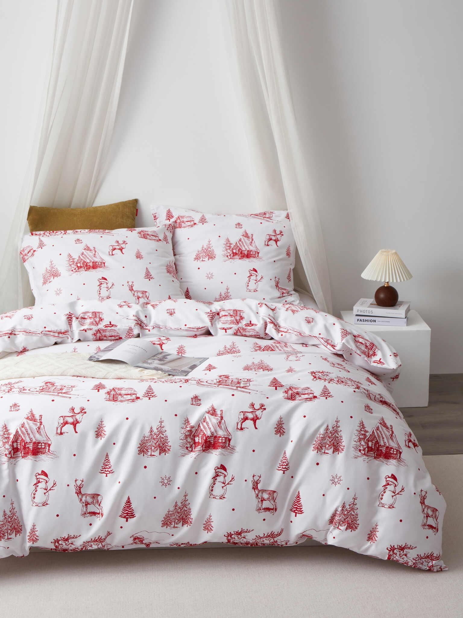 Spod Igły I Nitki Pościel Świąteczna Satyna Bawełniana Laponia 160X200 Biała Czerwona Zimowy Krajobraz Karczew