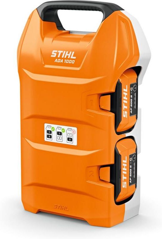 Adapter STIHL ADA 1000 umożliwia podłączenie dwóch akumulatorów AP do dmuchawy lub kosiarki, zapewniając ciągłą pracę bez konieczności częstego ładowania.