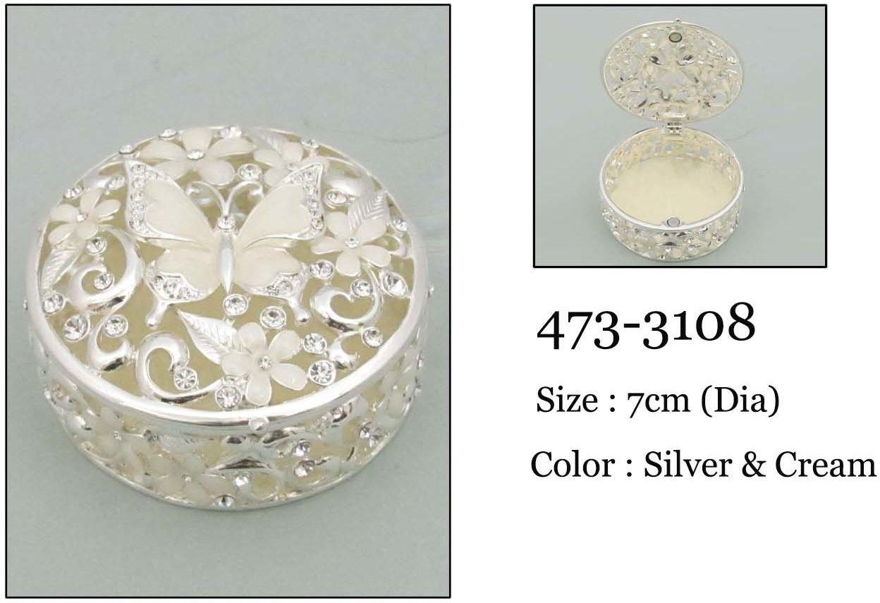 Ozdoba- otwierane PUZDERKO, okrągła szkatułka wykonana z posrebrzanego stopu cynku oraz żywicy epoksydowej ze zdobieniami cyrkoniami oraz motylem na środku.Przedstawiony produkt firmowany jest marką Summer P., chińską, cenioną w kraju i zagranicą, marką obecną na rynku już kilkunastu lat, a zajmującą się produkcją artykułów do dekoracji i ozdoby wnętrza(idealnych na upominki i prezenty), dekoracyjnej porcelany oraz ceramiki stołowej. Podstawowa specyfikacja: wymiary = do około 7x7x3,5cm materiał wykonania: stop cynku + żywica epoksydowa podstawowy kolor: mleczny opakowanie: kartonowe kolekcja: Summer P.