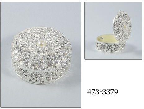 Urocze puzderko na biżuterię ozdobione masą perłową i kryształkami. Puzderko, szkatułka 473-3379 Urokliwe puzderko na biżuterię. Wykonane jest z metalu platerowanego na kolor srebrny połyskujący. Puzderka wewnątrz oblane jest sztuczną masą perłową. Zewnątrz puzderko jest srebrne i obsypane białymi …