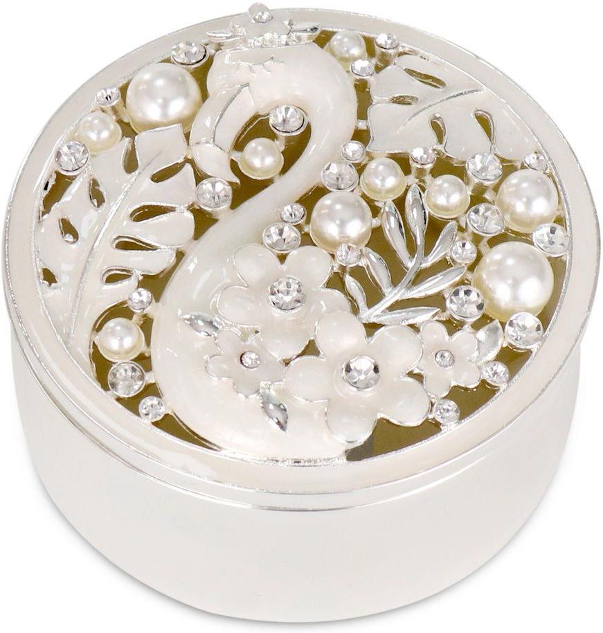 Ozdoba- PUZDERKO z białym flamingiem na pokrywce, OKRĄGŁA szkatułka ze zdobieniami cyrkoniowymi oraz perłowymi, wykonana ze stopu cynku oraz żywicy epoksydowej. Pomalowana na kolor srebrny.Przedstawiony produkt firmowany jest marką Summer P., chińską, cenioną w kraju i zagranicą, marką obecną na rynku już kilkunastu lat, a zajmującą się produkcją artykułów do dekoracji i ozdoby wnętrza(idealnych na upominki i prezenty), dekoracyjnej porcelany oraz ceramiki stołowej. Podstawowa specyfikacja: wymiary = do około 7,5×7,5×4,2 cm materiał wykonania: stop cynku + żywica epoksydowa podstawowy kolor: posrebrzany opakowanie: kartonowe kolekcja: Summer P.