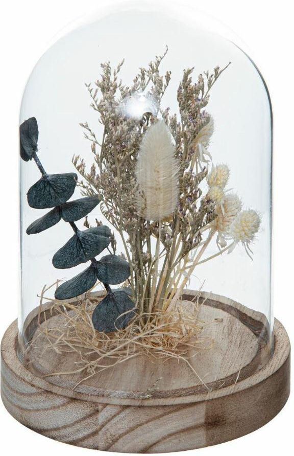 Suszone kwiaty pod kloszem House - piękna naturalna dekoracja Kompozycja z suszonych kwiatów pod szklanym kloszem stanowi piękną i ciekawą dekorację każdego naturalnego wnętrza. Dekoracja umieszczona na drewnianej podstawie jest wykonana z suszonych roślin i szkła, a jego waga wynosi 0,307 kg. …