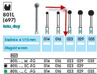 Doskonałej jakości stomatologiczne wiertła diamentowe - o kształcie kulek przedłużonych 801L 014-016 FG, na turbinę produkcji niemieckiej firmy NTI-Kahla GmbH. NTI oferuje ponad 400 różnych wierteł diamentowych o maksymalnie sześciu różnych ziarnach do każdej sytuacji w praktyce dentystycznej. Obejmują one ziarna od super zgrubnego do szybkiego szlifowania i usuwania starych wypełnień, przez zgrubne i średnie do usuwania, wstępnego szlifowania i uniwersalnego szlifowania struktury zęba, po drobne, bardzo drobne i ultra drobne wykańczania i wygładzania wypełnień kompozytowych. W cenie tutaj podanej w średnicach 014-016. W uziarnieniu drobnym, średnim, zgrubnym i extra zgrubnym.