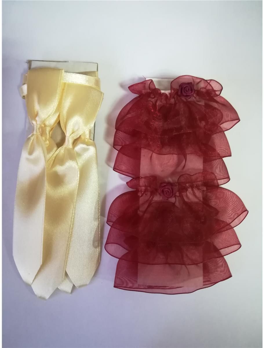 ZAWIESZKA NA BUTELKĘ WESELNĄ KRAWAT I MINI ECR BO Brak Weselny zestaw krawatów i podwiązek na butelki Zestaw składa się z : 6 krawatów w kolorze ecri uszytych z atłasu. 6 podwiązek uszytych z tiulu w kolorze bordowym ozdobionych różą. Komplet na 12 butelek. Zawieszki wielokrotnego użytku