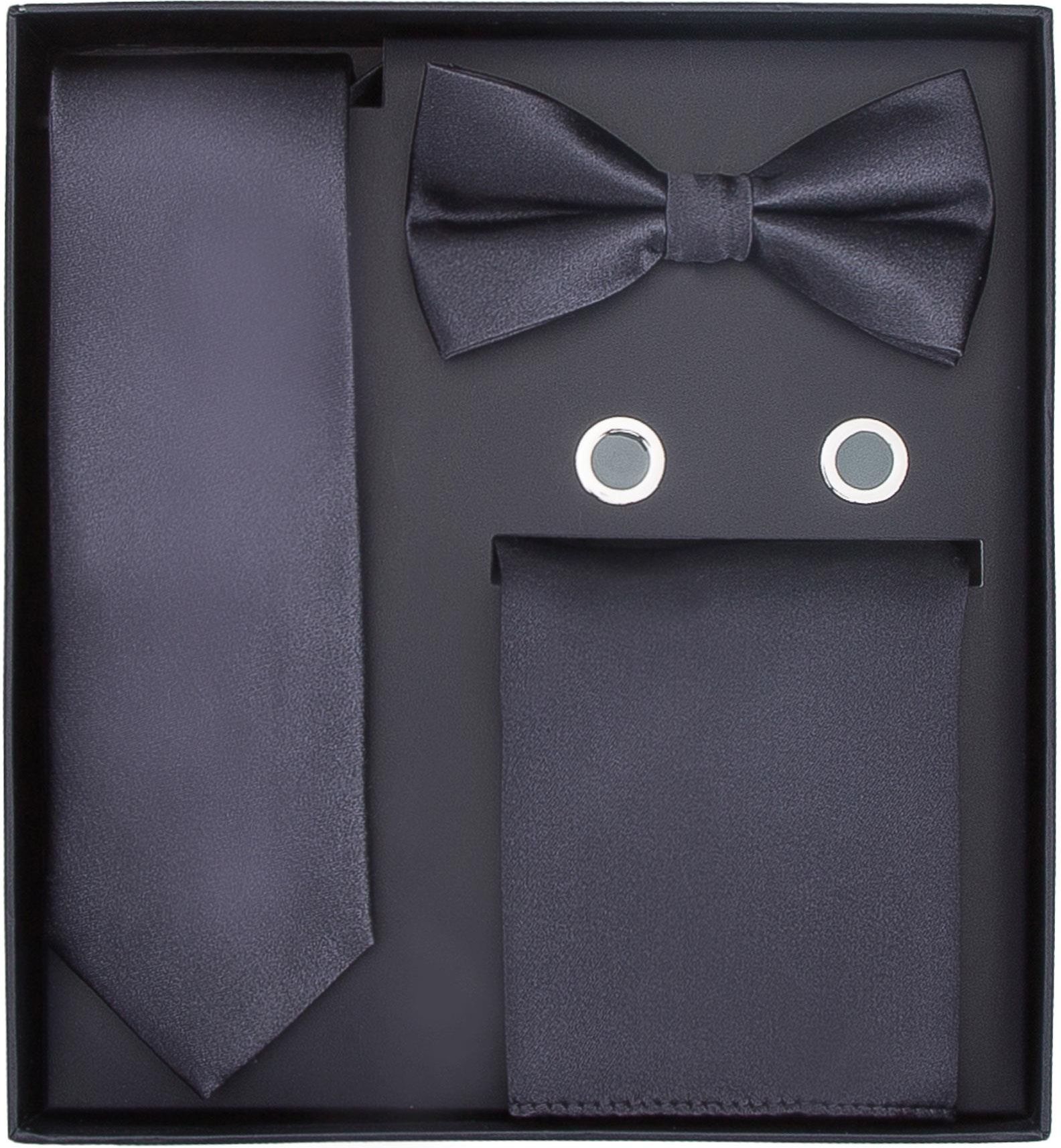 4-elementowy zestaw dodatków dla mężczyzny. Elegancki zestaw dla wielbiciela klasycznego męskiego szyku. Wewnątrz pudełka znajduje się krawat, mucha i poszetka z jedwabiu, a także komplet pasujących emaliowanych spinek do mankietów. Jedwabna tkanina najwyższej jakości ma przyjemną, prążkowaną …