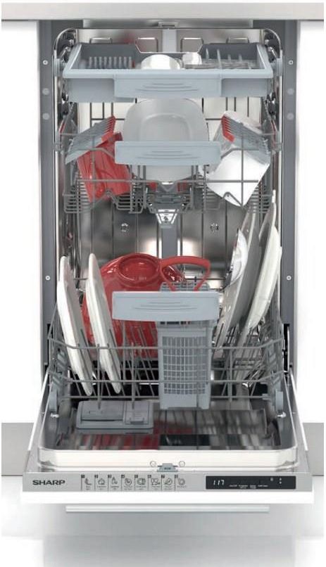 Sharp QW-NS1GI47EX-DE Zmywarka zintegrowana do zabudowy, typu slim, o szerokości 45 cm.   Dane podstawowe • Kolor: Biały • Klasa energetyczna: A++/E • Klasa zmywania: A • Klasa suszenia: A • Poziom głośności: 47 dB(A) • Zużycie wody: 9 litrów • Pojemność zmywarki: 10 kompletów • Programy: 8 • …