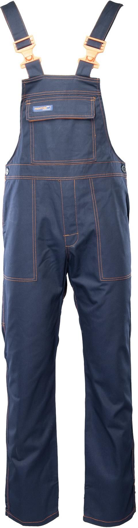 Spodnie ogrodniczki robocze antystatyczne Profflam, Polstar AOOG, granatowe. Spodnie posiadają długie, szerokie, regulowane szelki. Duża ilość ryglówek w miejscach szczególnie narażonych na rozprucie. Spodnie posiadają wszyty klin w kroku zwiększający swobodę ruchów oraz komfort użytkownika. Spodnie wyposażone są w dwie kieszenie w tylnej części spodni, dwie kieszenie boczne, wzmocniona kieszeń zapinana na rzepy, kieszeń na miarkę „metrówkę”. Możliwość regulacji w pasie za pomocą guzików oraz gumki wszytej w tylnej części spodni.