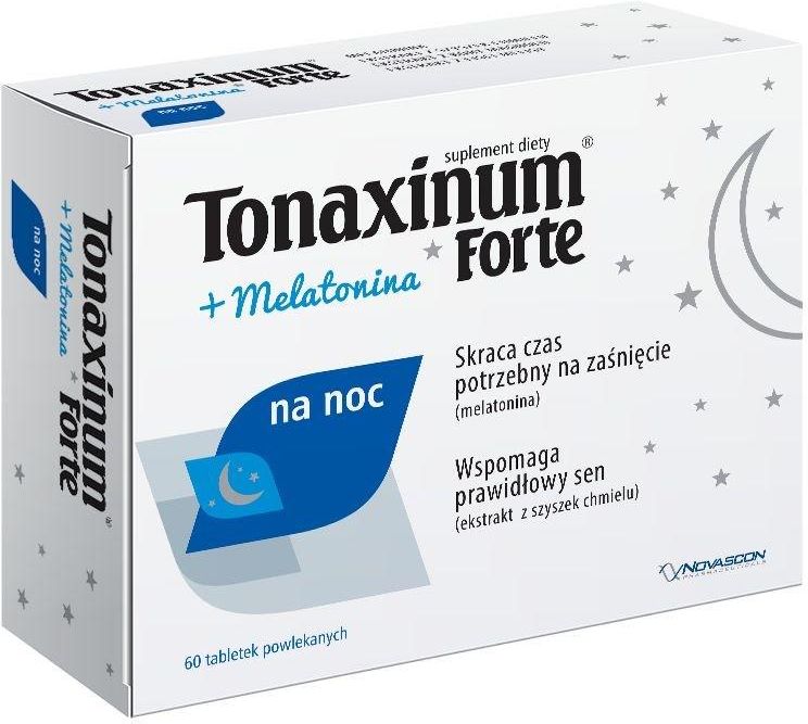 Tonaxinum Forte na noc + Melatonina suplement diety to suplement diety przeznaczony dla osób żyjących w stresie. Zawarte w nim składniki pochodzenia roślinnego i L-tryptofan wspomagają uśmierzenie napięcia nerwowego, i zachowanie przejrzystego umysłu.      Zastosowanie:  Dzięki składnikom pomaga w skróceniu czasu potrzebnego na zaśnięcie oraz wspomaga prawidłowy sen.  Melatonina pomaga w skróceniu czasu potrzebnego na zaśnięcie 1 . Ponadto, przyczynia się do łagodzenia subiektywnego odczucia zespołu nagłej zmiany strefy czasowej 2 . Ekstrakt z szyszek chmielu wspomaga prawidłowy sen oraz działa kojąco na układ nerwowy. Ekstrakt z liści melisy wspomaga odprężenie i zdrowy sen. Ekstrakt z kory magnolii przyczynia się do utrzymania dobrego samopoczucia fizycznego. 1 korzystne działanie występuje po spożyciu 1 mg melatoniny na krótko przed snem.  2 korzystne działanie występuje przy spożywaniu 0,5 mg melatoniny krótko przed snem pierwszego dnia podróży i przez kolejne kilka dni po przybyciu do celu podróży. Zalecana do spożycia dzienna porcja preparatu: 1-2 tabletki powlekane dziennie. Sposób użycia: Preparat należy przyjmować w trakcie lub po posiłku, w godzinach popołudniowych lub wieczornych. Popić wodą. Skład porcji zalecanej do spożycia w ciągu dnia:  Zawartość w 1 tabletce powlekanej: Melatonina - 0,5 mg Ekstrakt z szyszek chmielu - 200 mg Ekstrakt z kory magnolii - 200 mg, w tym:  honokiol 2% - 4 mg Ekstrakt z liści melisy - 100 mg Ostrzeżenie: Nie należy przekraczać porcji zalecanej do spożycia w ciągu dnia. Preparat nie może być stosowany jako substytut zróżnicowanej diety. Preparatu nie zaleca się stosować przez kobiety w okresie ciąży i karmienia piersią oraz w przypadku nadwrażliwości na którykolwiek ze składników preparatu. Preparat może osłabiać koncentrację i szybkość reakcji oraz wpływać na zdolność prowadzenia pojazdów i obsługę urządzeń mechanicznych w ruchu. Nie należy spożywać alkoholu podczas stosowania preparatu. Zrównoważona dieta oraz zdrowy tryb życia są ważne dla prawidłowego funkcjonowania organizmu.  Warunki przechowywania: Suplement diety należy przechowywać w temperaturze pokojowej (15-25°C), w suchym miejscu niedostępnym dla małych dzieci. Chronić przed wilgocią i światłem.  Producent :  Novascon Pharmaceuticals Sp. z o.o. Al. Jana Pawła II 80, 00-175 Warszawa www.ceviforte.pl