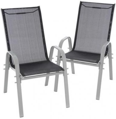 Zestaw 2 krzeseł ogrodowych kempingowe czarne stelaż szary Krzesło sztaplowane z wysokie oparcie wykonane z podwójnie malowanej proszkowo stalowej ramy idealnie nadaje się do użytku wewnątrz i na zewnątrz. Siedzisko i oparcie krzesła wykonane są z czarnego, elastycznego pokrycia Textilene. Krzesło ma podłokietniki po prawej i lewej stronie, co zapewnia relaksujące siedzenie. Kilka krzeseł można łatwo ustawiać jeden na drugim, aby zaoszczędzić miejsce, gdy nie są używane. Materiały użyte w tym krześle są bezobsługowe, odporne na warunki atmosferyczne i nie wymagają specjalnych środków pielęgnacyjnych.SPECYFIKACJA TECHNICZNA Materiał: Textilene 2x1 (pokrycie) + stal (rama) Kolor stelaża: jasnoszary Kolor okładki: czarny Wymiary całkowite (po złożeniu): SxGxW 55 x 72 x 97 cm Wymiary siedziska: ok. 42 x 45 cm Wymiary oparcia: ok. 58 x 45 cm Wysokość siedziska: ok. 43 cm Szerokość podłokietnika: ok. 4 cm max. obciążenie ok. 110 kg