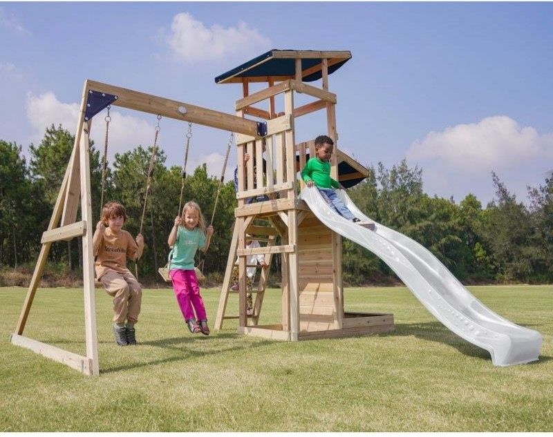 Duży Plac Zabaw Malik - Biały Zestaw Dzięki różnorodnym elementom - wieży widokowej, długiej zjeżdżalni, podwójnej huśtawce i piaskownicy - dzieci mogą rozwijać swoją kreatywność, siłę i koordynację ruchową w jednym miejscu! To doskonałe połączenie ruchu, przygody i bezpieczeństwa w naturalnym, ekologicznym wydaniu Wykonany w 100% z drewna cedrowego FSC, odpornego na warunki atmosferyczne i gnicie Drewno zostało zabezpieczone ekologiczną bejcą na bazie wody, wolną od chemikaliów Produkt spełnia normy CE, EN 71, FSC 100%, UKCA Charakterystyka: - Wielofunkcyjny zestaw do zabawy - wspinaczka, zjeżdżanie, huśtanie się i zabawa w piasku w jednym miejscu! - Podwójna huśtawka - Długa 220 cm zjeżdżalnia z możliwością podłączenia wody dla dodatkowej frajdy w upalne dni - Piaskownica z daszkiem i ścianką do zabawy- Bezpieczna i stabilna konstrukcja - zestaw posiada 6 kotew gruntowych dla maksymalnej stabilności - Zestaw przeznaczony dla maksymalnie 5 dzieci ( Maksymalna waga na dziecko: 50 kg ) - Łatwy montaż - proste instrukcje i częściowo wstępnie zmontowane elementy pozwalają na szybkie złożenie placu zabaw. Dane techniczne: Wymiary całkowite: 345 x 336 x 269,5 cm ✔ Wysokość platformy: 119 cm ✔ Waga maksymalna: 200 kg (50 kg na dziecko) ✔ Zjeżdżalnia: 220 cm, możliwość podłączenia wody ✔ Piaskownica: 125 kg piasku, wymiary 83,2 x 80 x 18,8 cm