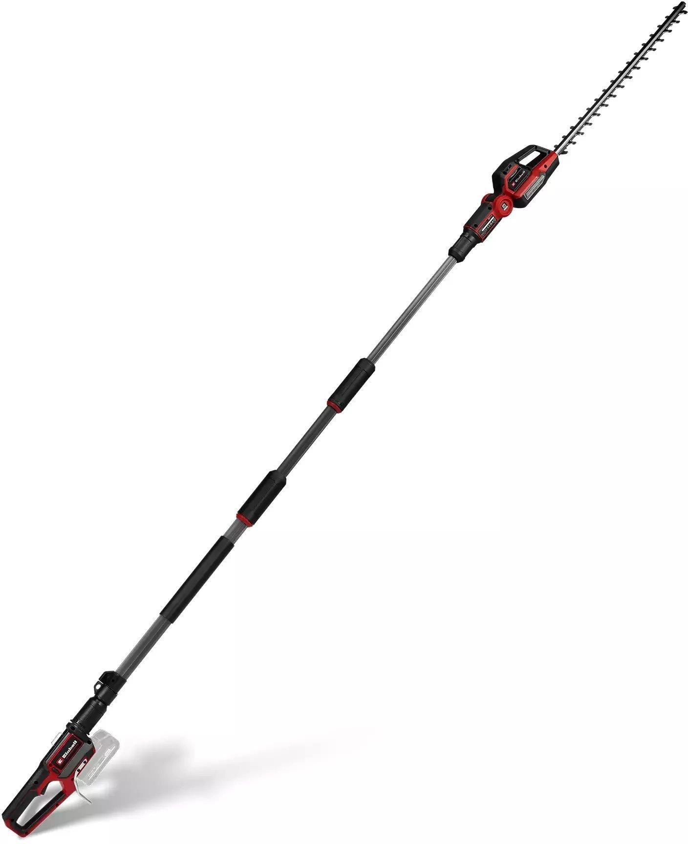 NOŻYCE DO ŻYWOPŁOTU NA WYSIĘGNIKU AKU GP-HH 18/50 LI T BL – SOLO EINHELL Akumulatorowe teleskopowe nożyce do żywopłotu Einhell Professional GP-HH 18/50 Li T BL-Solo to niezawodne narzędzie do pielęgnacji wysokich żywopłotów. Model należy do systemu Power X-Change, zapewniając swobodę pracy bez przewodu. Urządzenie napędza bezszczotkowy silnik Einhell (Brushless), który gwarantuje większą moc oraz dłuższy czas pracy. Teleskopowy wysięgnik można beznarzędziowo regulować do długości nawet 2,9 m, co umożliwia wygodne przycinanie wysokich partii żywopłotu. Głowica tnąca z 8-stopniową regulacją kąta nachylenia oraz ostrza cięte laserowo i szlifowane diamentowo zapewniają precyzyjne i czyste cięcie. Wytrzymała metalowa przekładnia została zaprojektowana z myślą o długiej żywotności urządzenia. W zestawie znajduje się pokrowiec ochronny ułatwiający transport i przechowywanie. Urządzenie dostarczane jest bez akumulatora i ładowarki (sprzedawane oddzielnie). Członek rodziny Power X-Change – wymagany 1 akumulator 18 V Bezszczotkowy silnik (Brushless) – większa moc i dłuższy czas pracy Bezstopniowo regulowany teleskopowy wysięgnik (bez użycia narzędzi) 8-stopniowa regulacja kąta głowicy tnącej dla elastycznej pracy Ostrza ze stali cięte laserowo i szlifowane diamentowo Metalowa przekładnia zapewniająca długą żywotność Powierzchnie Softgrip dla wygodnego i pewnego chwytu Dodatkowa gumowana powierzchnia podparcia zwiększająca stabilność pracy Stalowa rama chroniąca akumulator przed uderzeniami Odchylana głowica silnika Dzięki 8-stopniowej regulacji nachylenia głowicy silnika możliwe są czyste i precyzyjne cięcia nad głową pod różnymi kątami. Osłona ochronna W zestawie znajduje się praktyczna osłona ochronna na ostrze nożyc do żywopłotu, zapewniająca bezpieczne przechowywanie. Ostre ostrza Laserowo wycinane i diamentowo szlifowane ostrza o długości 55 cm zapewniają precyzyjne i czyste cięcie nawet wysokich żywopłotów. Metalowa przekładnia Wytrzymała konstrukcja gwarantuje długą żywotność i niezawodną pracę nożyc wysięgnikowych do żywopłotu.” Dane techniczne Typ zasilania: Akumulatorowe Napięcie zasilania [V]: 18 Rodzaj silnika: Bezszczotkowy Ilość baterii w zestawie: 0 Ładowarka w zestawie: nie Długość miecza [cm]: 55 Długość cięcia [cm]: 50 Odstępy między zębami [mm]: 25