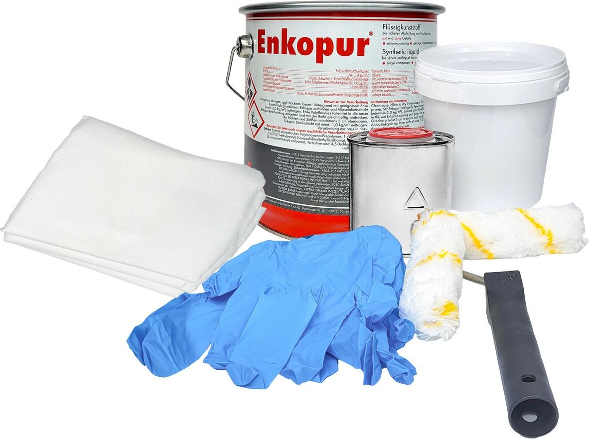 Zestaw Do Uszczelniania Dachu z 9 Elementami Zestaw zawiera: Enke Enkopur Folia Uszczelniająca w Płynie: 4 KG - to folia w płynie przystosowana do różnych rodzajów dachów. Podkład do Enkopur: Odpowiednia ilość - podkład, który ma na celu poprawę przyczepności folii uszczelniającej do podłoża. Szmatka Materiałowa: 1mb - do przygotowania i czyszczenia powierzchni przed aplikacją folii. Wałki: 2 sztuki - służą do równomiernego rozprowadzania folii na dachu. Uchwyt Do Wałka: 1 sztuka - narzędzie ułatwiające prace z wałkami. Pojemnik: 1L - przeznaczony do mieszania i przygotowywania folii. Rękawiczki: 2 pary - zapewniają ochronę dłoni podczas pracy. W zestawie podawane produkty są dedykowane do pracy przy uszczelnianiu dachu.