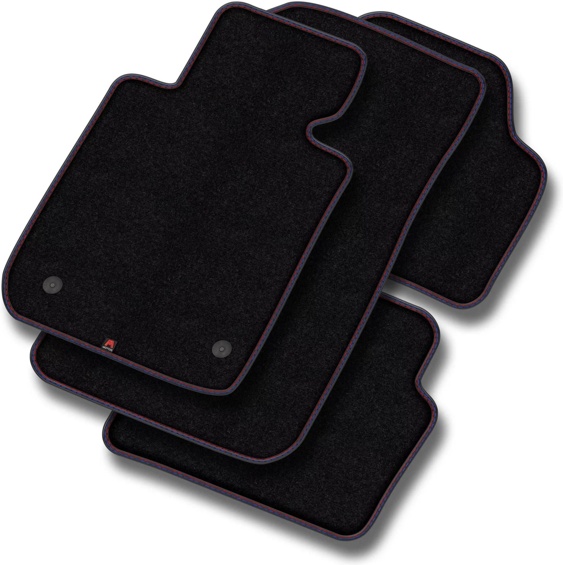 Dywaniki Welurowe Motos Premium Do Mazda 6 I 2002 2008 Czarna Lamowka Skorzana Blyszczaca Obszyta Czerwona I Niebieska nić Karpacz