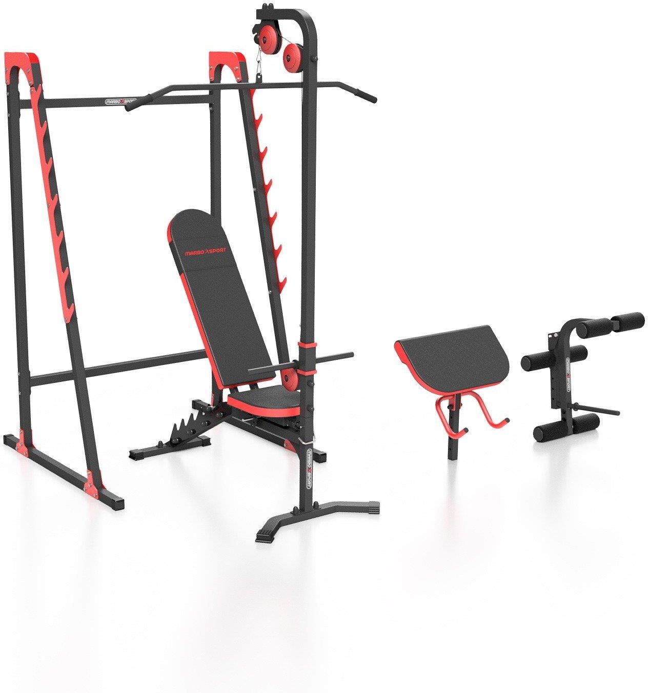 Zestaw MH26 | Ławka regulowana + stojaki wielopoziomowe + prasa na nogi + wyciąg + modlitewnik (wsuwka) - Marbo Sport Zawartość zestawu Ławka dwustronnie regulowana MH-L115 Stojaki wielopoziomowe MH-S204 Prasa z regulacją do ćwiczenia nóg do ławek Home MH-A102 Modlitewnik z uchwytami do ławek Home …