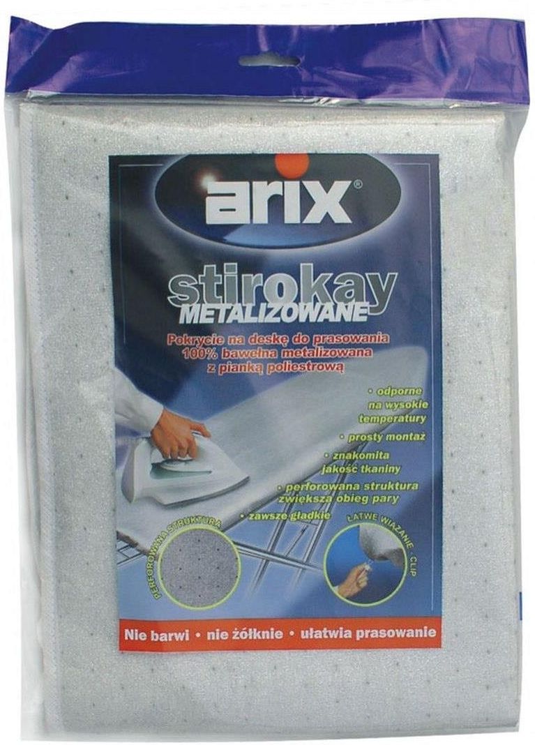 SILVER STIROKAY (easy fix system) Rozmiar: ok. 140x50cm 100% BAWEŁNA BARDZO WYSOKA JAKOŚĆ! UŁATWIA PRASOWANIE - SZYBKO I SKUTECZNIE! LUX PERFOROWANY, GRUBY POKROWIEC BAWEŁNIANY (METALIZOWANY) na deskę do prasowania z GRUBĄ gąbką poliestrową Pasuje na dużą deskę o rozmiarze, np.: ok. 130x40, 135x45.. Właściwości: Wykonany ze ZNAKOMITEJ JAKOŚCI jakości bawełny z gąbką poliestrową oraz perforacją o strukturze srebrnej. Warstwa metalizowana odbija wysoką temperaturę skracając czas prasowania. Specjalna struktura i perforacja zwiększa obieg pary co ułatwia prasowanie. Bawełna metalizowana nie zawiera niebezpiecznych barwników. Nie barwi prasowanych ubrań Odporny na bardzo wysokie temperatury Łatwy w montażu Posiada specjalny sznurek z KLIPSEM zaciskowym (easy-fix system) ułatwiający dokładne naciągnięcie pokrowca na deskę. Oryginalny WŁOSKI Wymiary: długość/szerokość: 140x50cm