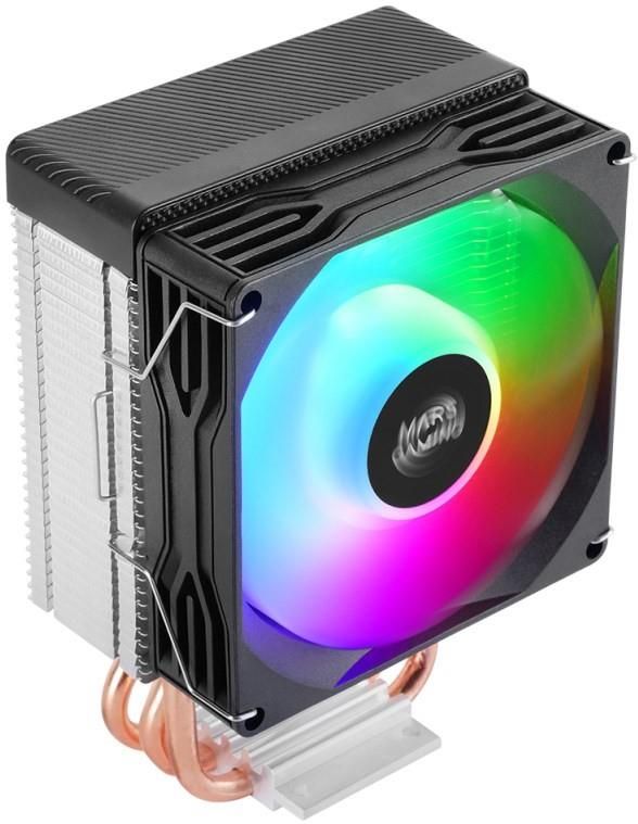 Specyfikacja Tworzywo chłodnicy Aluminium Tworzywo płyta podstawy Miedź Ilość ciepłowodów 3 Złącze wentylatora 4-pin Materiał statecznika Aluminium Kolor produktu Czarny Kolor podświetlenia Wielokolorowy Liczba wentylatorów 1 wentylator Oświetlenie LED Tak Napięcie LED 5 V Prąd wentylatora 0,2 A …
