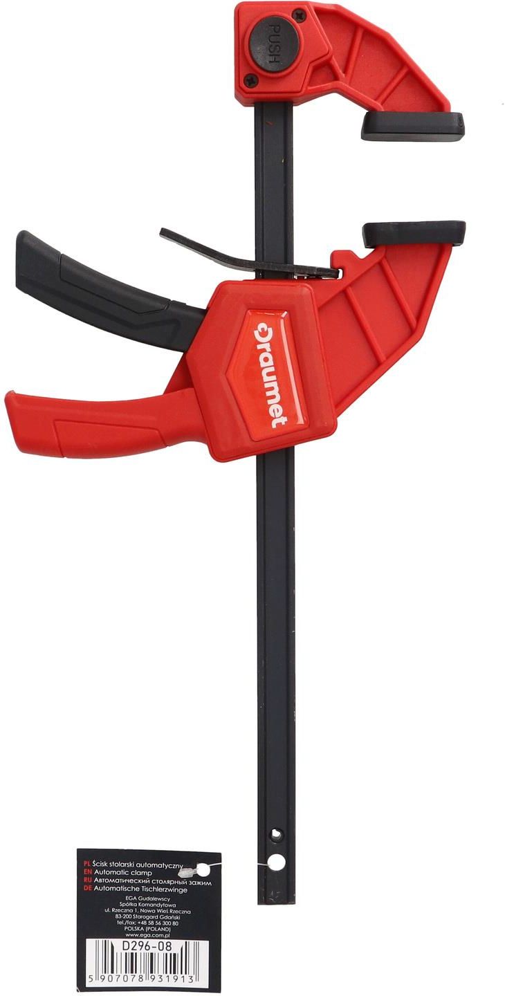 Ścisk stolarski automatyczny DRAUMET 63mm x 150mm AUTOMAT D296-08 to kompaktowe, a zarazem niezwykle funkcjonalne narzędzie, które idealnie sprawdzi się w pracach stolarskich, montażowych oraz warsztatowych. Dzięki solidnej konstrukcji oraz nowoczesnym rozwiązaniom technicznym zapewnia stabilne mocowanie elementów, precyzyjne zaciskanie i wygodę użytkowania. Zalety ścisku stolarskiego DRAUMET: Funkcja ścisku i rozpieraka: Dzięki możliwości łatwego przełożenia szczęk, narzędzie pełni funkcję zarówno ścisku, jak i rozpieraka, co zwiększa jego wszechstronność. Mechanizm automatyczny: Umożliwia szybkie i precyzyjne zaciskanie bez konieczności regulacji siły docisku, co znacznie przyspiesza pracę. Ergonomiczny uchwyt: Zapewnia wygodny, pewny chwyt, minimalizując zmęczenie dłoni podczas długotrwałych prac. Solidna konstrukcja: Wykonany z wytrzymałych materiałów odpornych na uszkodzenia mechaniczne i intensywne użytkowanie. Kompaktowy rozmiar: Idealny do precyzyjnych prac w trudno dostępnych miejscach oraz przy mniejszych projektach. Parametry techniczne: Długość całkowita: 150 mm Głębokość szczęk: 63 mm Waga: 0,310 kg Funkcje: Ścisk i rozpierak Rodzaj mechanizmu: Automatyczny Zastosowanie: Ścisk stolarski DRAUMET 63mm x 150mm AUTOMAT to niezastąpione narzędzie przy klejeniu, montażu mebli, pracach modelarskich, łączeniu elementów drewnianych, metalowych i tworzyw sztucznych. Dzięki kompaktowej konstrukcji sprawdzi się zarówno w profesjonalnych warsztatach, jak i w domowych pracach DIY.