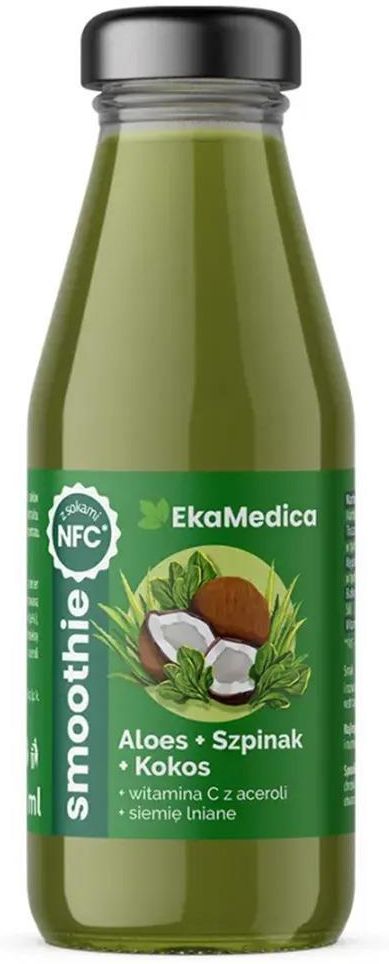 EkaMedica, Smoothie Aloes Kokos Szpinak – unikalne połączenie smaków – delikatnego aloesu, egzotycznego kokosa i odświeżającego szpinaku. Powstaje na bazie soków i przecierów NFC (nie z koncentratu), co gwarantuje naturalny charakter i wysoką jakość produktu. Wzbogacone o siemię lniane oraz witaminę C z ekstrakt z owoców aceroli. Bez dodatku cukru i substancji konserwujących, smoothie zawiera wyłącznie cukry naturalnie występujące w owocach. Dzięki praktycznej butelce to świetna propozycja na drugie śniadanie, przekąskę w ciągu dnia lub po treningu.