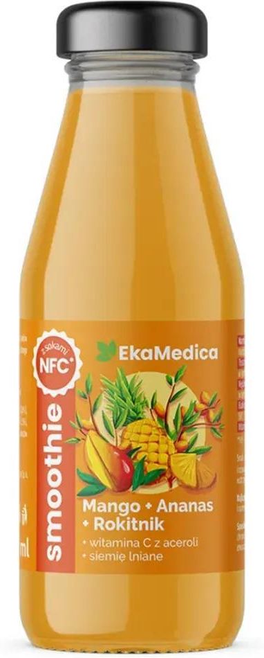 EkaMedica, Smoothie Mango Ananas Rokitnik – tropikalno-owocowa kompozycja o intensywnym smaku mango i ananasa, wzbogacona lekko cierpką nutą rokitnika. Napój powstaje na bazie soków i przecierów NFC (nie z koncentratu), co zapewnia mu pełnię naturalnego smaku. Zawiera siemię lniane oraz dodatek witaminy C z ekstraktu z owoców aceroli. Smoothie nie zawiera dodatku cukru ani substancji konserwujących – słodycz pochodzi wyłącznie z owoców. W poręcznej butelce smoothie świetnie sprawdzi się jako szybka przekąska, dodatek do posiłku czy zdrowy napój w pracy, szkole lub po treningu.
