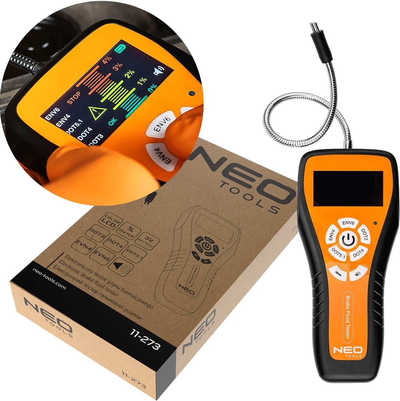 Elektroniczny Tester Płynu Hamulcowego DOT3 DOT4 DOT5 EVN4 EVN6 Kolorowy wyświetlacz NEO Elektroniczny Tester Płynu Hamulcowego od Neo Tools to niezastąpione narzędzie dla każdego, kto pragnie zadbać o bezpieczeństwo swojego pojazdu. Właściwy stan płynu hamulcowego ma kluczowe znaczenie dla prawidłowego działania układu hamulcowego, a przez to dla bezpieczeństwa jazdy. Dzięki testerowi płynów hamulcowych można szybko i dokładnie sprawdzić jakość płynu hamulcowego, co jest nieocenione zarówno dla profesjonalnych mechaników, jak i pasjonatów motoryzacji. Przekonaj się, jak wiele korzyści niesie ze sobą to innowacyjne narzędzie. Zakres pomiarowy Pomiar jakości płynu hamulcowego to kluczowy element zapewniania bezpieczeństwa na drodze. Regularne sprawdzanie stanu płynu pozwala uniknąć niebezpiecznych sytuacji podczas jazdy, gdyż zanieczyszczenie płynu wodą może prowadzić do nieprawidłowego działania układu hamulcowego. W przypadku testera płynów hamulcowych, użytkownik ma możliwość pomiaru najpopularniejszych typów płynów, takich jak DOT3, DOT4, DOT5.1, EVN4 oraz EVN6. To urządzenie dokładnie mierzy procentową zawartość wody w płynie, co zapewnia szybki i precyzyjny wynik. Dodatkowo, tester emituje sygnał dźwiękowy, informujący o wynikach pomiaru, z możliwością wyciszenia, co zwiększa komfort użytkowania. Dodatkowe funkcje Tester płynów hamulcowych oferuje szereg funkcji, które zwiększają jego wszechstronność i użyteczność. Oprócz pomiaru jakości płynu, urządzenie charakteryzuje się łatwą kalibracją. Kalibracja jest istotna, ponieważ pozwala na zachowanie dokładności pomiarów w różnych warunkach. Wystarczy zanurzyć sondę w świeżym płynie, aby dostosować ustawienia. Dzięki temu użytkownik zawsze ma do dyspozycji precyzyjne wyniki, co jest nieocenione w krytycznych sytuacjach. Wyświetlacz Model wyposażony jest w kolorowy wyświetlacz LCD, który zapewnia doskonałą czytelność. Regulacja jasności umożliwia dostosowanie intensywności wyświetlacza do panujących warunków oświetleniowych, co jest niezwykle istotne podczas pracy w warsztatach czy w trudnych warunkach. Intuicyjny interfejs użytkownika sprawia, że obsługa jest prosta i przyjemna, co pozwala skupić się na wykonywanych pomiarach. Zasilanie Zasilanie na baterie 2×1.5V AA to praktyczne rozwiązanie, które zapewnia wygodę oraz mobilność. Dzięki temu użytkownik nie jest ograniczony kablem zasilającym, co umożliwia swobodne korzystanie z urządzenia w różnych warunkach. Zasilanie na baterie pozwala na bezproblemowe użycie testera zarówno w warsztacie, jak i w terenie, co czyni go niezwykle wszechstronnym narzędziem. Zalety Elektronicznego Testera Płynu Hamulcowego Warto podkreślić, że kluczowe zalety testera płynów hamulcowych mają ogromne znaczenie dla użytkowników, którzy cenią sobie bezpieczeństwo i wygodę. Oto najważniejsze cechy, które wyróżniają to urządzenie: Tester płynów hamulcowych oferuje wiele zalet, które warto poznać: szeroki zakres pomiarowy: obsługuje różne typy płynów hamulcowych, szybkie pomiary: procentowa zawartość wody mierzona z sygnałem dźwiękowym, łatwa kalibracja: prosta regulacja przy użyciu świeżego płynu, czytelny wyświetlacz: kolorowy LCD z regulacją jasności, mobilne zasilanie: baterie AA zapewniają swobodę ruchu, atrakcyjny design: dobrze widoczna obudowa ułatwia pracę w różnych warunkach. Akcesoria W zestawie z testerem znajdują się niezbędne akcesoria, które zwiększają komfort użytkowania. Dołączone elementy, takie jak przewód pomiarowy i instrukcja obsługi, sprawiają, że produkt jest gotowy do użycia od razu po zakupie. Dzięki tym dodatkowym akcesoriom, użytkownicy mogą w pełni cieszyć się możliwościami swojego urządzenia.