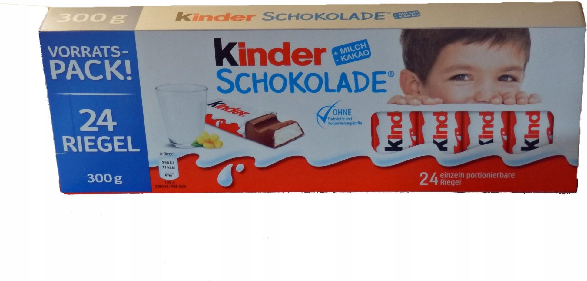 Batoniki - czekoladki Kinder FERRERO prosto z NIEMIEC 300 g 24 batoniki super smaczne i zdrowe batoniki, produkt rewelacyjny. Kinder Czekoladki to produkt stworzony specjalnie dla dzieci. Zawiera dużo mleka, a tym samym białko, wapń i sole mineralne. Delikatny smak Kinder Czekolady jest uwielbiany …