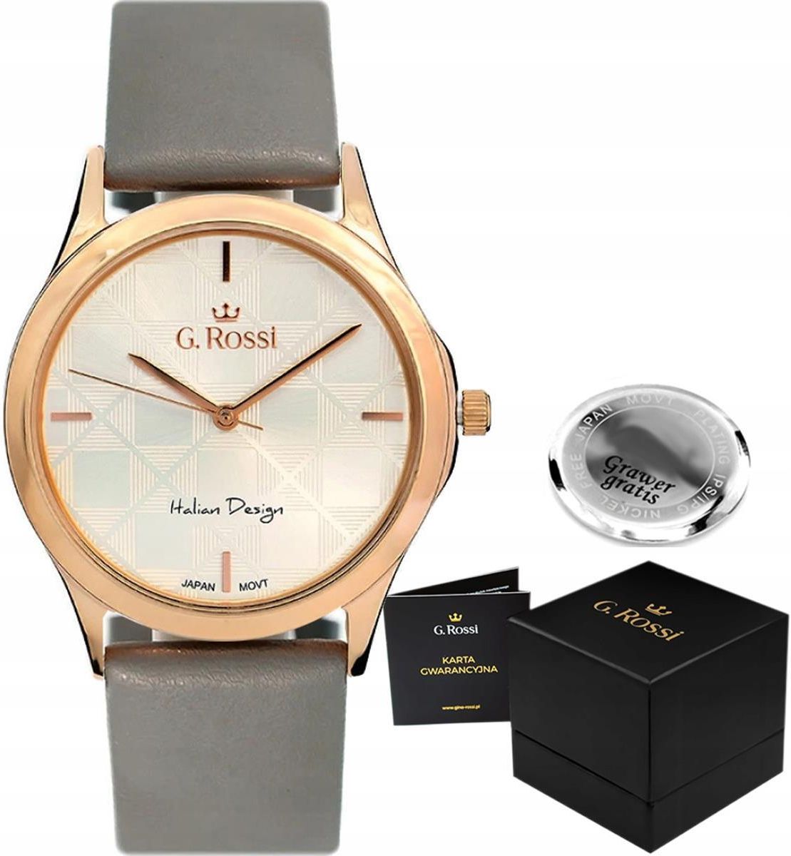 Zegarek damski G. ROSSI MIROE z dwoma paskami 10513-3B4 Już dziś wybierz swój nowy, elegancki, funkcjonalny, a co najważniejsze klasyczny zegarek, który sprawdzi się bez względu na okazję. Zegarek Greca wyposażony został w niezawodny mechanizm kwarcowy, zapewniający wieloletnią żywotność oraz precyzyjne odmierzanie czasu. Nowoczesna jasna tarcza z motywem ozdobnym zapewnia przejrzysty i czytelny wygląd. Koperta zegarka połączona została z siatką mesh i skórzanym paskiem. Wodoszczelność 30M oznacza że, zegarek jest odporny na zachlapania. Czasomierze te wyprodukowane są z bezpiecznych materiałów, które nie tylko nadają się dla osób z wrażliwą skórą, ale i również dla alergików. Zegarek sprawdzi się jako prezent, który zachwyci swoim wyglądem, funkcjonalnością oraz będzie stanowił wartościową pamiątkę. Nasza firma oferuje również dodatkowo płatną usługę grawerowania, dzięki której możemy podarować bliskiej nam osobie pamiątkę w formie dedykacji na zegarku, co stanowi niepowtarzalny i wyjątkowy upominek. Idealny na prezent dla kobiet ceniących sobie styl i elegancję. Mechanizm: W zegarku osadzony został japoński mechanizm kwarcowy Miyota. Pasek/bransoleta: Skórzany, Stalowa siatka mesh. Koperta: Metalowa, pokryta utwardzaną powłoką IPS/IPG. Szkiełko: Mineralne. Tarcza: Sygnowana logiem producenta. Wodoszczelność: Water Resist 3 BAR (30M) zegarek jest odporny na przypadkowe zachlapania wodą np. podczas mycia rąk. Kolorystyka: Tarcza: kolor srebrny, Wskazówki: kolor różowe złoto, Koperta: kolor różowe złoto, Pasek skórzany: kolor szary, Siatka mesh: kolor różowe złoto. Gwarancja: Pisemna 12 miesięcy. Wymiary: koperta: szer 38mm x wys 46 mm, grubość koperty: 10 mm, tarcza średnica: 31 mm, szerokość paska: 20 mm, maksymalny obwód: do 21 cm.