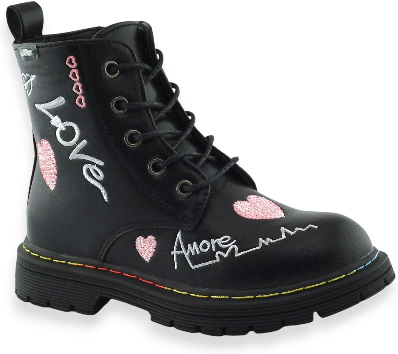 Czarne trapery dla dziewczynki z ekoskóry, ozdobione wyszywanymi serduszkami, są niezwykle stylowe i eleganckie. Idealnie sprawdzą się na jesienne i wiosenne spacery oraz do szkoły. Dodatkowym akcent to kolorowa nitka biegnąca wzdłuż podeszwy.