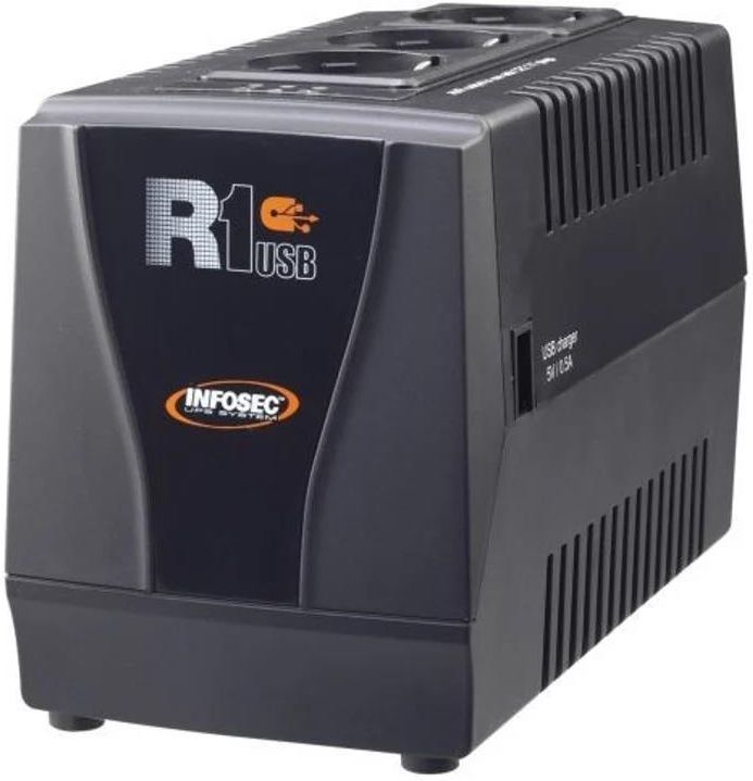Infosec R1 USB 1000. Maksymalna możliwa do konfiguracji moc: 1 kVA, Moc rzeczywista: 500 W, Napięcie operacyjne wejścia (minimalne): 184 V. Typy wyjść AC: Typu F, Ilość gniazd sieciowych: 3 x gniazdo sieciowe, Typ portu USB: USB Typu-A. Układ: Kompaktowy, Kolor produktu: Czarny. Certyfikaty zgodności: RoHS, Certyfikaty: CE. Szerokość produktu: 95 mm, Głębokość produktu: 180 mm, Wysokość produktu: 119 mm