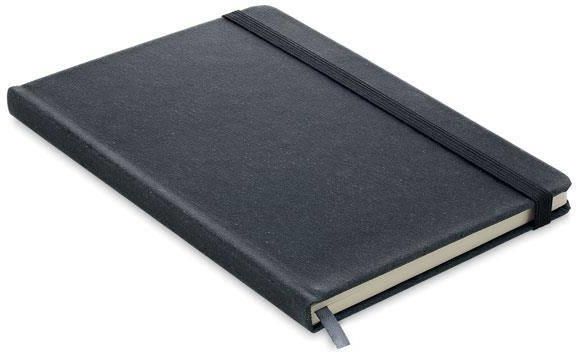 Notatnik A5 w okładce z poliuretanu pochodzącego z recyklingu i 80 kartkami w linię, zamykany gumką, zawiera wstążkę.