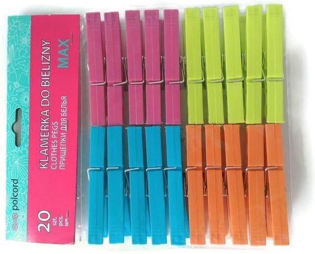 KLAMERKI DO BIELIZNY POLCORD MAX 20SZT 1541 Klasyczne klamerki do spinania ubrań. Wykonane z tworzywa sztucznego oraz metalu. Zapewnią komfort wieszania ubrań. Doskonale sprawdzą się do wieszania grubych i dużych rzeczy typu koc, kurtka, pościele itp. Dają pewność, że ubrania nie spadną z sznurka. Wymiary: dług. 8,5cm x szer. 1 cm x głęb. 2cm Opakowanie zawiera 20szt - mix koloru.