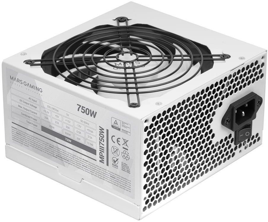 Mars Gaming MPIII750W moduł zasilaczy 750 W 20+4 pin ATX ATX Biały Mars Gaming MPIII750W. Moc w sumie: 750 W, Napięcie wejściowe AC: 200 - 240 V, Częstotliwość wejściowa AC: 50/60 Hz. Motherboard power connector: 20+4 pin ATX, Typ okablowania: Niemodularne. Przeznaczenie: PC, Rodzaj zasilacza (PSU): ATX, Poziom hałasu: 14 dB. Kolor produktu: Biały, Rodzaj chłodzenia: Aktywne, Średnica czaszy wentylatora: 12 cm. Certyfikaty zgodności: CE, RoHS, TÜV mark, Certyfikaty: ATX12V Najważniejsze parametry techniczne Konstrukcja - Rodzaj chłodzenia: Aktywne Konstrukcja - Liczba wentylatorów: 1 went. Konstrukcja - Umiejscowienie wentylatora: Górne Chłodzenie - Średnica czaszy wentylatora: 12 cm Wydajność - Kolor produktu: Biały Wydajność - Poziom hałasu: 14 dB Wydajność - Certyfikat 80 PLUS: Nie Wydajność - Rodzaj zasilacza (PSU): ATX Wydajność - Tryb cichy: Tak Wydajność - Technologia łożysk: FDB Wydajność - Funkcje ochrony zasilania: Zabezpieczenie przeciążeniowe, Ochrona przez zbyt wysokim napięciem, Krótkie spięcie, Zabezpieczenie przed zbyt niskim napięciem Porty i interfejsy - Motherboard power connector: 20+4 pin ATX Porty i interfejsy - Ilość złączy zasilających SATA: 6 Porty i interfejsy - Złącza zasilania Peripheral (Molex) (4-pin): 4 Porty i interfejsy - Złącze zasilania EPS (4+4 pin): Tak Porty i interfejsy - Złącza zasilające PCI Express (6+2 pin): 2 Porty i interfejsy - Typ okablowania: Niemodularne Bateria - Przeznaczenie: PC Wewnętrzne We/Wy - Gniazdo zasilania ATX (24-pin): Tak Waga i rozmiary - Waga produktu: 1,55 kg Waga i rozmiary - Szerokość produktu: 150 mm Waga i rozmiary - Głębokość produktu: 145 mm Waga i rozmiary - Wysokość produktu: 85 mm Dane opakowania - Szerokość opakowania: 125 mm Dane opakowania - Głębokość opakowania: 238 mm Dane opakowania - Wysokość opakowania: 205 mm Dane opakowania - Waga wraz z opakowaniem: 1,69 kg Dane opakowania - Rodzaj opakowania: Pudełko Moc - Moc w sumie: 750 W Technical details - Wbudowany wyłącznik: Tak Moc - Typ PFC (Power Factor Correction) – korekcji współczynnika mocy: Aktywne Moc - Łączna moc (+3.3 V): 200 W Moc - Łączna moc (+12 V): 600 W Moc - Łączna moc (+5 V): 200 W Moc - Łączna moc (-12V): 6 W Moc - Łączna moc (+5 Vsb): 12,5 W Moc - Maksymalny prąd wyjściowy (+3.3V): 25 A Moc - Maksymalny prąd wyjściowy (+12 V): 50 A Moc - Maksymalny prąd wyjściowy (+5 V): 27 A Moc - Maksymalny prąd wyjściowy (-12 V): 0,5 A Moc - Maksymalny prąd wyjściowy (+5 Vsb): 2,5 A Moc - Prąd wejściowy: 7 A Moc - Napięcie wejściowe AC: 200 - 240 V Moc - Częstotliwość wejściowa AC: 50/60 Hz Moc - Wydajność: 85% Technical details - Certyfikaty zgodności: CE, RoHS, TÜV mark Cechy - Certyfikaty: ATX12V Klasyfikacja - Kod producenta: 8435693106814 Klasyfikacja - EAN: 8435693106814 Klasyfikacja - ID Produktu: 124422305