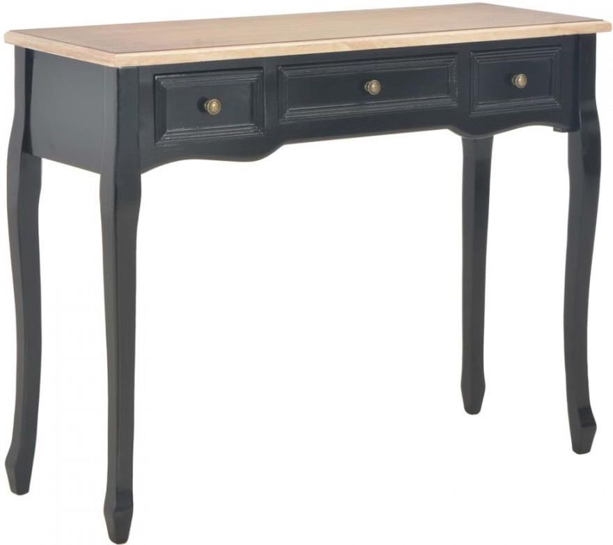 Stolik konsolowy z 3 szufladami, czarny vidaXL Kolor: Array Rozmiar: Array Nasza konsola o prostej lecz ponadczasowej formie będzie znakomitym dodatkiem do Twojego salonu, jadalni, korytarza i innych pomieszczeń. Stolik łączy znakomite wykonanie z funkcjonalnością. Dzięki kompaktowej formie zajmuje on bardzo mało miejsca i pasuje do mniejszych wnętrz. Trzy płynnie wysuwające się szuflady zapewniają dodatkowe miejsce na Twoje ozdoby, kosmetyki lub inne przedmioty. Ten stolik garderobiany wykonany jest z wysokiej jakości płyty MDF oraz drewna sosnowego z czarnym wykończeniem, co zapewnia wiele lat użytkowania. Kolor: czarno-brązowy Materiał: MDF + drewno sosnowe Wymiary całkowite: 100 x 35 x 78 cm (dł. x szer. x wys.) Wymiary dużej szuflady: 36,5 x 29 x 9,5 cm (dł. x szer. x wys.) Wymiary małej szuflady: 24,4 x 29 x 9,5 cm (dł.x szer. x wys.) Z żelaznymi gałkami OSTRZEŻENIE: aby zapobiec przewróceniu się produktu, musi on zostać przymocowany do ściany za pomocą dołączonego elementu montażowego Legal Documents:Więcej informacji na temat zabezpieczenia mebli przed przewróceniem można znaleźć tutaj