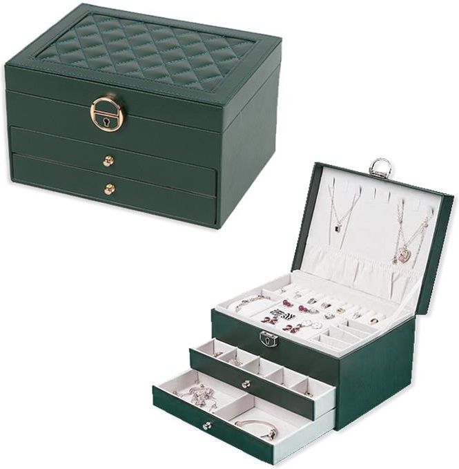 POJEMNA SZKATUŁKA NA BIŻUTERIĘ Szkatułkę charakteryzuje elegancka, subtelna oprawa, wykonana z dbałością o każdy najdrobniejszy detal. Jej styl wpasuje się idealnie w wystrój każdego wnętrza, będzie pięknie prezentować się na toaletce, stoliku, w sypialni, na komodzie, w garderobie, czy też w dziecięcym pokoju. Specyfikacja Kolor: zielony Wysokość: 13,5 cm Szerokość: 23 cm Głębokość: 17 cm Materiał: skóra ekologiczna Kluczyk w zestawie Po otrzymaniu produktu z względu na specyfikę materiału, radzimy przetrzeć obudowę i szufladki wilgotną szmatką. ORGANIZACJA BIŻUTERII - kuferek na biżuterię umożliwia skuteczną organizację Twojej kolekcji. Posiada różne rozmiary przegródek i kieszeni, które ułatwiają przechowywanie wszystkich rodzajów biżuterii, takich jak pierścionki, naszyjniki, bransoletki, zegarki czy kolczyki. Dzięki temu możesz łatwo znaleźć i wybrać odpowiednią biżuterię do noszenia. ZAMYKANY NA KLUCZ – dzięki dołączonemu kluczykowi zyskujesz pewność, że nikt oprócz Ciebie nie korzysta z kuferka, nie ogląda i nie pożycza biżuterii. To dodatkowa ochrona wartościowych przedmiotów. KUFEREK JEST ELEGANCKI I POJEMNY – ponadczasowy wzór, ładny kształt i srebrne elementy wykończenia dodają klasy kuferkowi, estetycznego oraz atrakcyjnego wyglądu. Dodatkowo kuferek jest pojemny, zmieścisz w nim wszystkie Swoje błyskotki. Nie czekaj, kup już dziś! To nie tylko szkatułka na biżuterię, to również doskonały prezent dla Ciebie samej lub dla bliskiej Ci osoby. Wywołaj radość i zachwyt na twarzy swojej przyjaciółki, siostry lub mamy, obdarowując je tym pięknym i funkcjonalnym akcesorium.