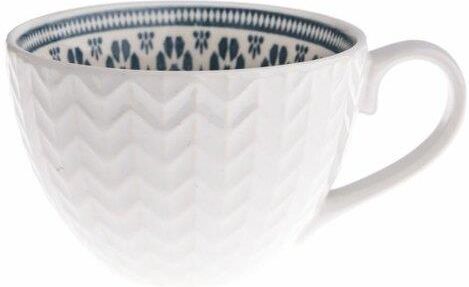 Niski kubek o pojemności 380 ml (pojemność liczona po rant kubka)wykonany z ceramiki, charakteryzujący się biało-beżowym kolorem. Kubek po zewnętrznej stronie posiada tłoczony wzór w kolorze białym przecieranym, natomiast wnętrze kubka zdobione jest ornamentalnym niebieskim wzorem. Całość tworzy …