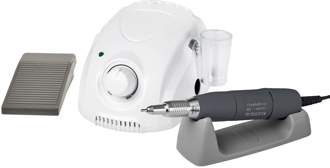 Marka Saeyang posiada w swojej ofercie wysokiej jakości narzędzia przydatne podczas wykonywania profesjonalnych zabiegów manicure oraz pedicure. Produkty Saeyang, cenione w gronie kosmetologów, charakteryzują się doskonałą jakością wykonania, precyzją oraz zastosowaniem innowacyjnych rozwiązań. Profesjonalne urządzenie do zabiegów manicure i pedicure Wysokiej klasy frezarka Saeyang Marathon 3 Champion to polecane przez kosmetologów urządzenie, które ułatwi dokładne opracowanie skórek i paznokci oraz usuwanie pozostałości poprzednich stylizacji, co znacznie usprawnia przygotowanie ich pod dalsze zabiegi. Dobre wyważenie głowicy oraz doskonale przemyślane funkcjonalności sprawiają, że frezarka doskonale sprawdzi się zarówno w użytku profesjonalnym, jak i domowym. Praktyczna głowica H35LSP Precyzyjna głowica H35LSP doskonale leży w ręce, co gwarantuje wysoki komfort użytkowania. Osiąga maksymalną prędkość 35 000 obrotów na minutę, wpływając na efektywność pracy. Głowica została wyposażona w prosty w obsłudze system Twist-Lock, ułatwiający szybką i płynną wymianę frezów. Pióro jest odpowiednio wyważone i ergonomicznie wyprofilowane, a dodatkowo drgania głowicy zostały ograniczone, dzięki czemu nawet wielogodzinna praca z frezarką nie męczy nadmiernie ręki. Plastikowa obudowa ogranicza przepływ ciepła, dzięki czemu nagrzewanie urządzenia nie jest odczuwalne. Elastyczny kabel sprężynka zapewnia wysoki komfort pracy, osiągając nawet 135 cm długości przy znacznym rozciągnięciu. Łatwość sterowania Regulacja prędkości przy użyciu pokrętła jest możliwa do 35 000 obrotów na minutę, co pozwala na dostosowanie do indywidualnych potrzeb, a co za tym idzie komfortowe wykonywanie szerokiej gamy zabiegów. Dodatkowo dioda kontrolna świeci w kolorze zielonym, ułatwiając rozpoznanie, czy frezarka pracuje na minimalnych obrotach. Praca z urządzeniem jest wyjątkowo łatwa, efektywna oraz intuicyjna, co zostanie docenione również przez bardziej wymagających użytkowników. Precyzyjne funkcjonalności dla komfortu użytkowania Dołączone do zestawu akcesoria zapewniają bezpieczeństwo oraz wygodę korzystania. Frezarka wyposażona jest w napęd nożny, umożliwiający precyzyjne kontrolowanie pracy głowicy i swobodną, komfortową pracę, dzięki możliwości sterowania urządzeniem bez użycia rąk. W trakcie pracy głowicę bezpiecznie można odłożyć na dołączony do zestawu dedykowany silikonowy stojak lub odwiesić dzięki wygodnemu plastikowemu uchwytowi, który można zamontować po obu stronach urządzenia. Miejsce na frezy na obudowie pozwala na przygotowanie niezbędnych narzędzi, by mieć je pod ręką w trakcie pracy. Opakowanie przyjazne dla środowiska Każda frezarka pakowana jest z myślą o środowisku — opakowania frezarek wykonano z materiałów przyjaznych dla planety. Wykorzystanie surowców nadających się do recyklingu oraz ograniczenie użycia plastiku pozwala minimalizować wpływ na naturę, wspierając zrównoważony rozwój. To świadomy wybór, który pozwala cieszyć się profesjonalnym sprzętem, przyczyniając się jednocześnie do ochrony środowiska. Nowoczesne urządzenie, cenione przez specjalistów Kultowa frezarka Saeyang Marathon 3 Champion o ergonomicznym kształcie doskonale łączy funkcjonalność z estetyką. Futurystyczna obudowa w odcieniach bieli doskonale wpasuje się w każde wnętrze i świetnie sprawdzi się nawet w niewielkich przestrzeniach. Dodatkowo urządzenie wyposażone jest w gumowane stopki, które nie tylko zapewniają stabilność, ale również chronią powierzchnię, na której stoi, przed ewentualnymi uszkodzeniami. Dzięki tym cechom, to urządzenie nie tylko doskonale spełnia swoje funkcje, ale również stanowi elegancki element wystroju wnętrza, podkreślając nowoczesny charakter pomieszczenia. Przed użyciem należy dokładnie zapoznać się z instrukcją. W zestawie: baza frezarki, głowica, zasilacz, napęd nożny, silikonowy stojak na głowicę, instrukcja. Dane: Kolor obudowy: odcienie bieli Prędkość obrotowa: 35 000 RPM Głowica z mechanizmem Twist-Lock Zasilanie: przewodowe Moc głowicy: 45 W Napięcie wejściowe: 110-240 V Gwarancja: 12 miesięcy